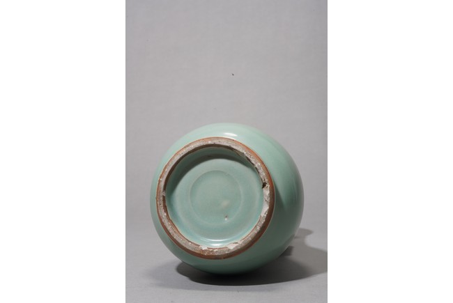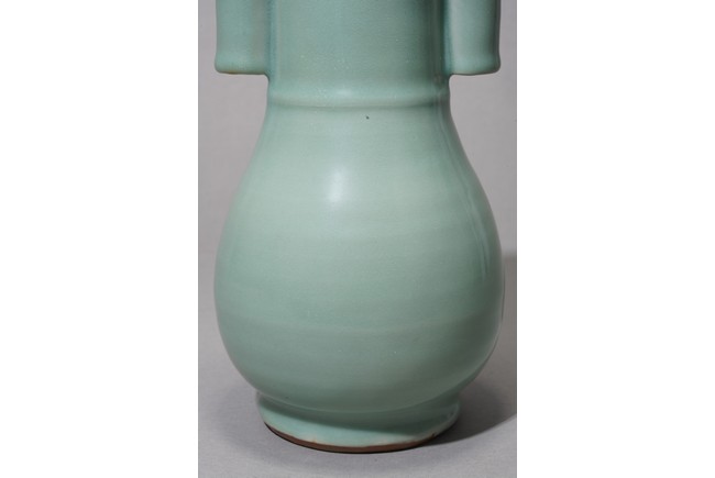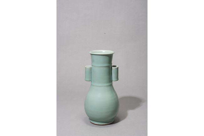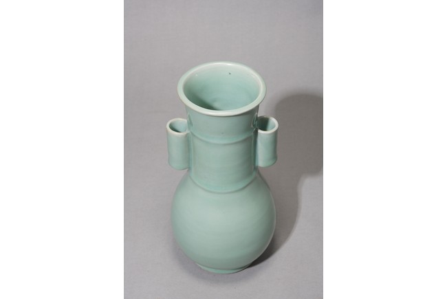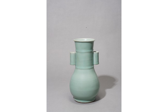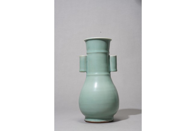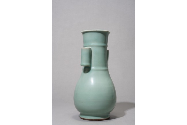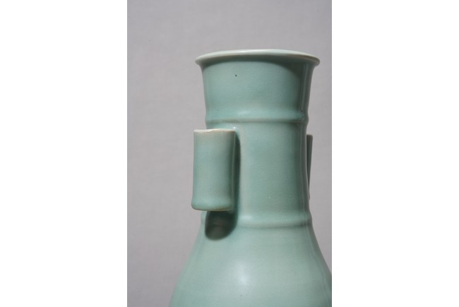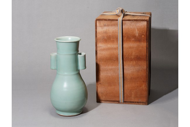 The vase has a globular body and tall long neck flanked by tubular handles, covered all over in soft sea-green tone. Accompanied with Japanese wood box. Possibly Southern Song Dynasty period.