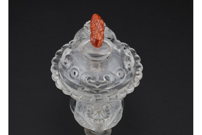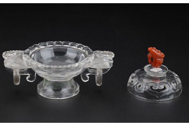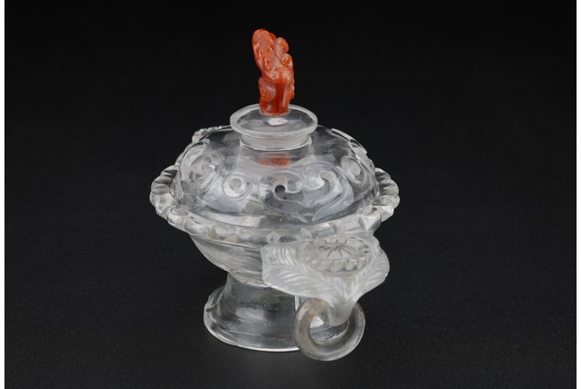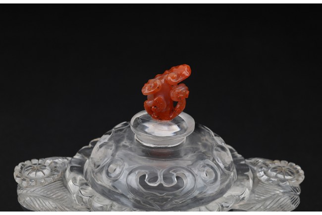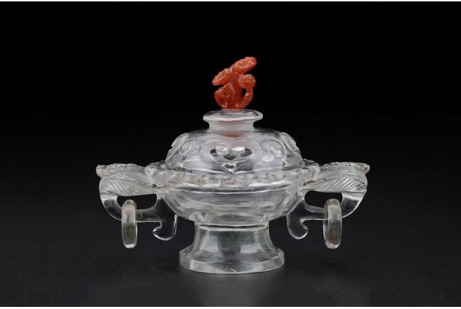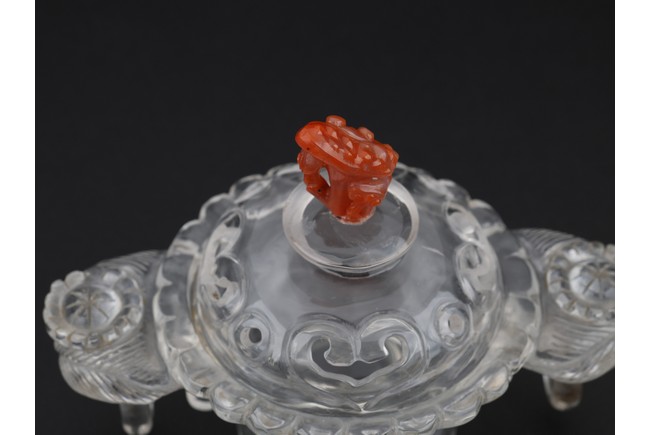 Supported on a spreading foot, the censer flanked by pair of leaf-form handles suspending loose rings, the reticulated cover surmounted with a carnelian agate 'lingzhi' finial. Qing Dynasty period.
