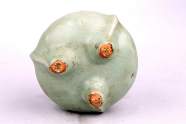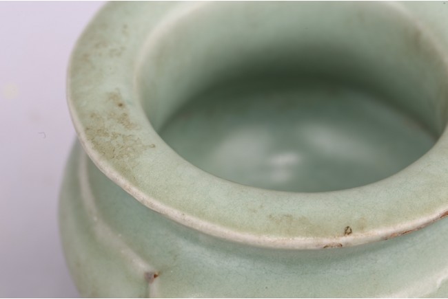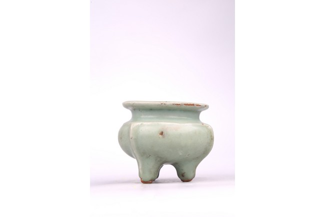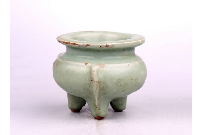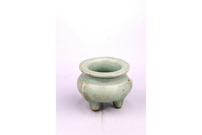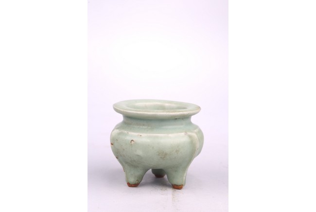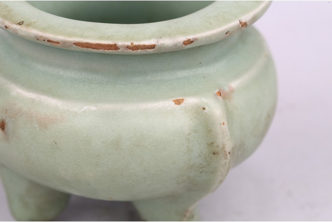 The compressed body is well potted and raised on three slightly splayed legs with narrow flanges. The censer is covered overall with a soft green glaze stopping above the tips of the feet. Song Dynasty period.