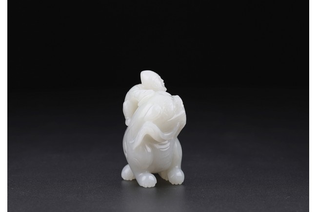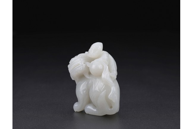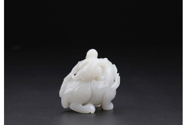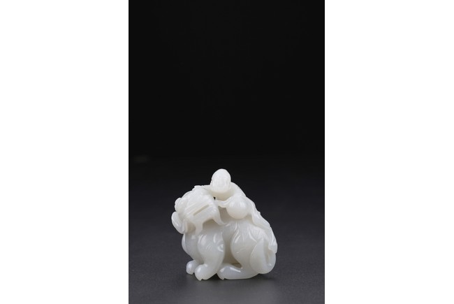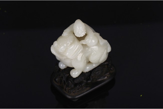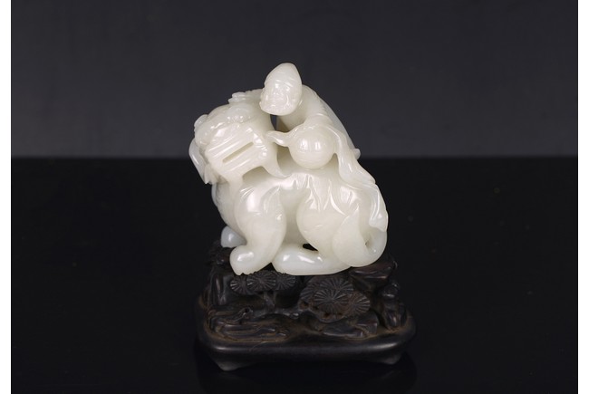 Carved in the form of a beard foreigner clambering on back of a buddhist lion with one hand resting on brocade ball, the lion head detailed with protruding eyes, large snout and curly mane, hardwood stand. Qing Dynasty period.
