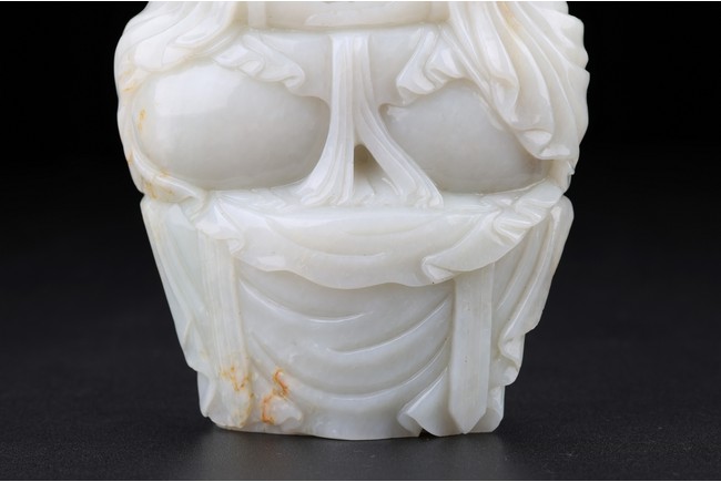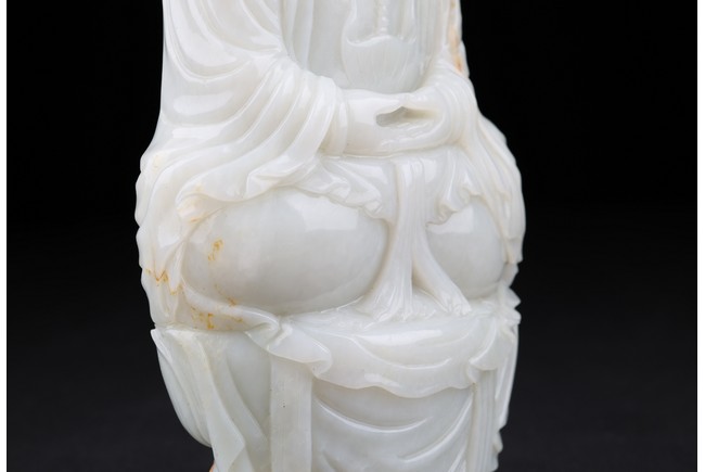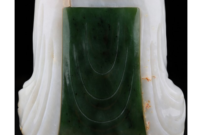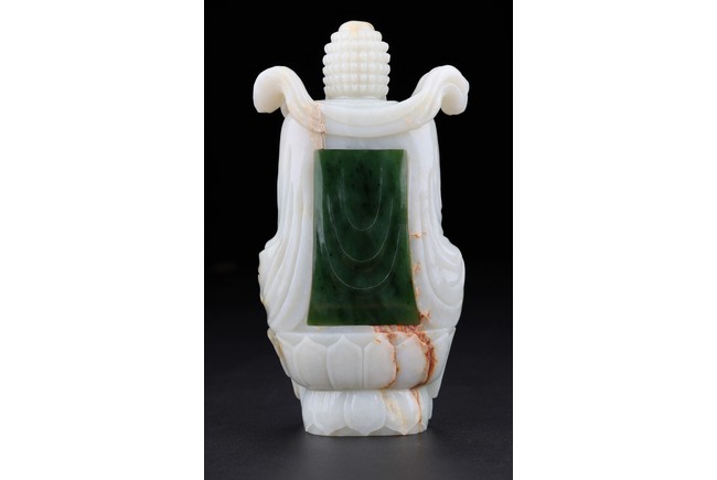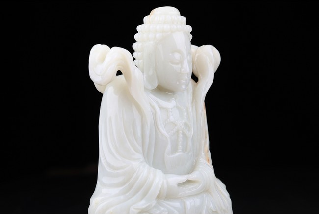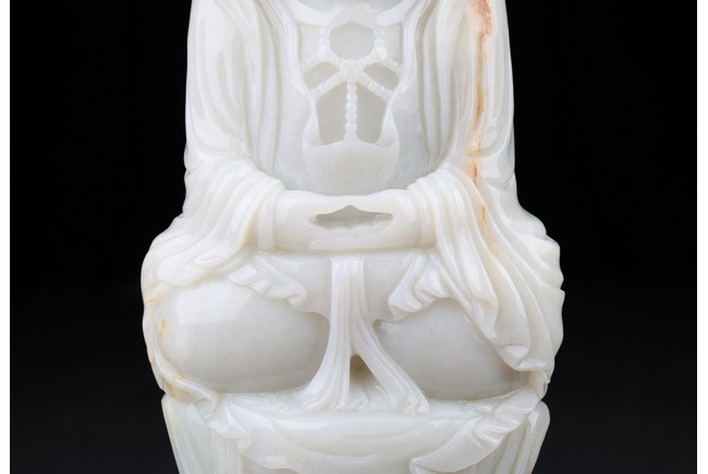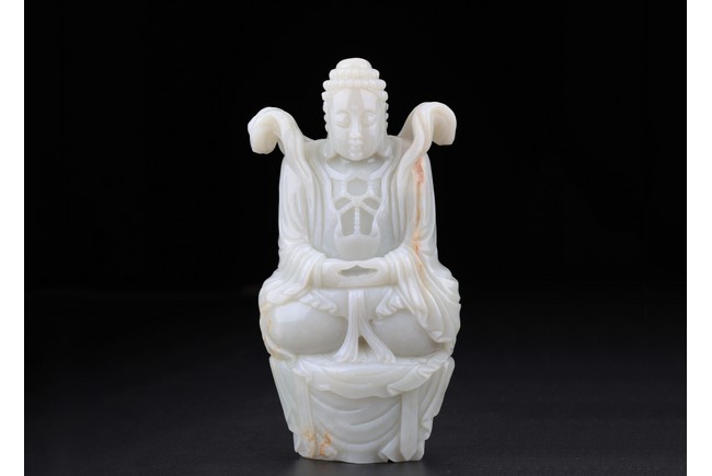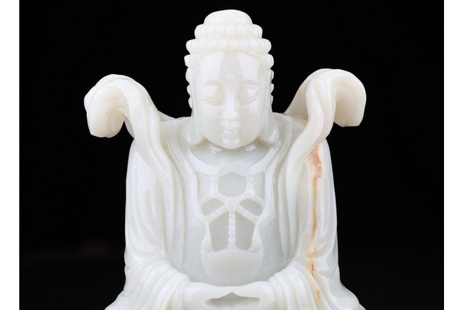 The buddha shown in a meditative expression seated on a plinth with both hands in dhyana mudra, wearing robe and flying ribbon over shoulders, his back embellished with a rectangular green jade panel. Qing Dynasty period.