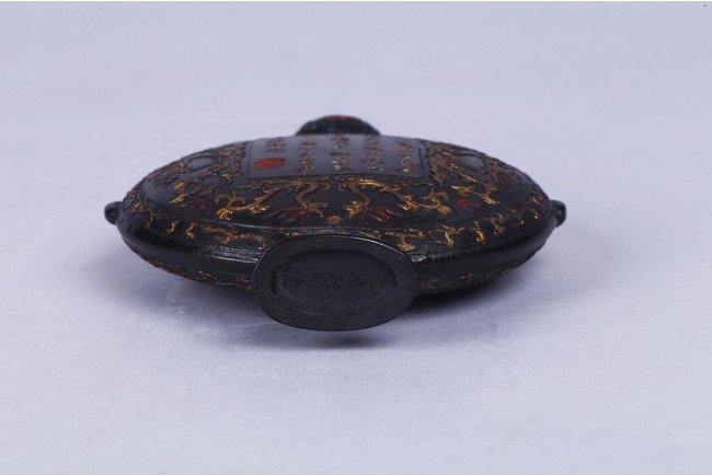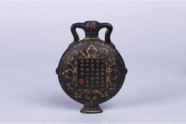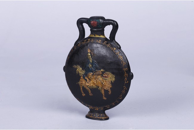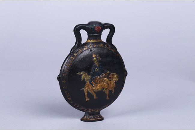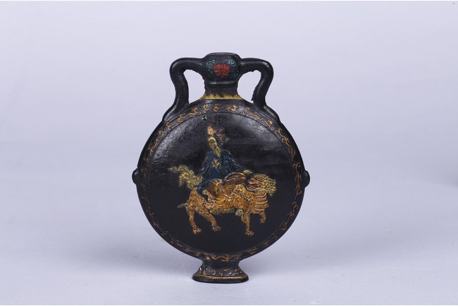 Modelled in the form of a moonflask, the body decorated in gilt paint with a bodhisattva riding a lion to front and inscription to the back.