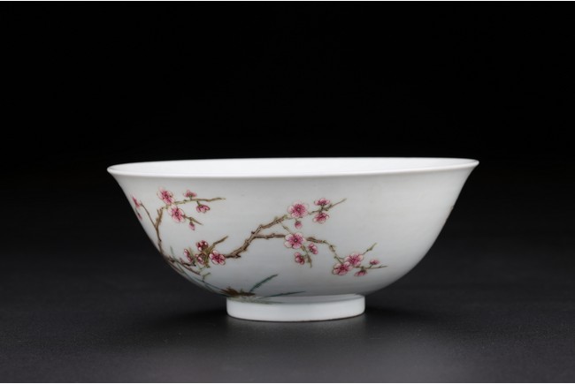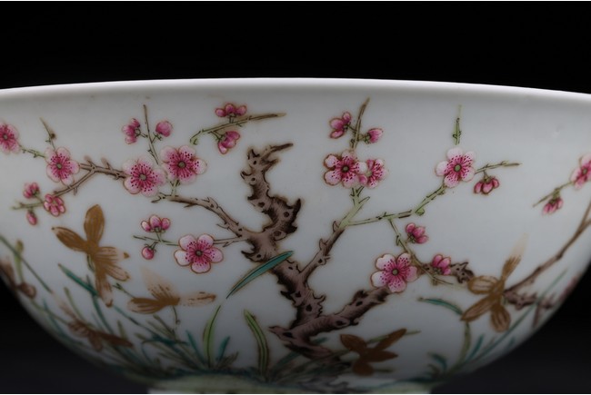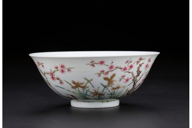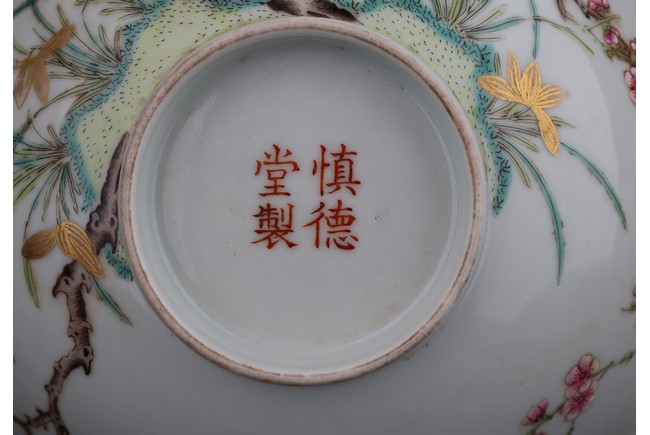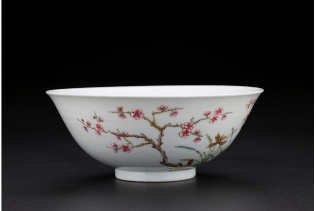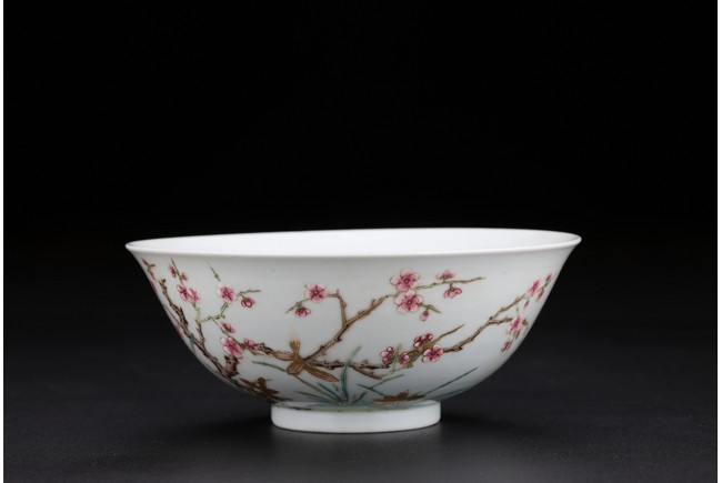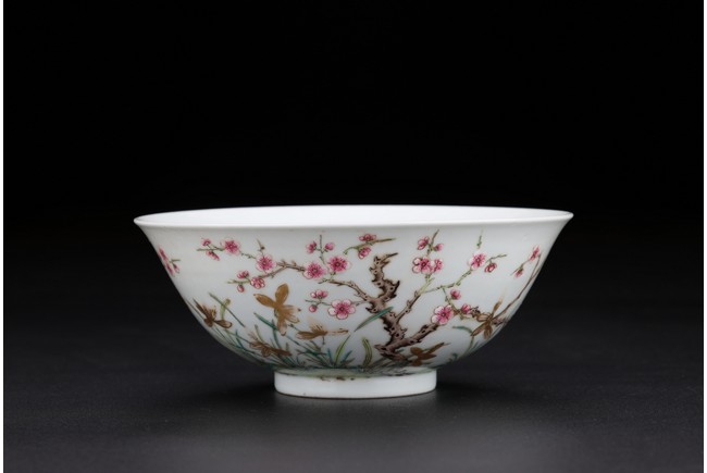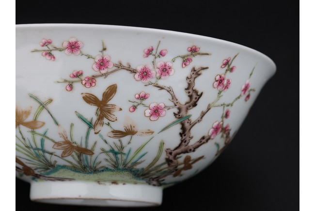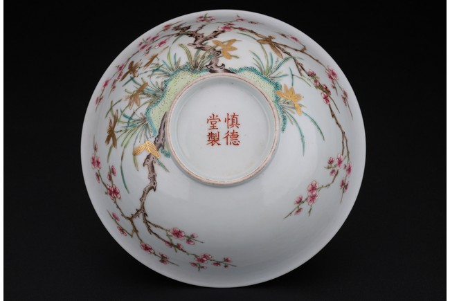 The finely potted bowl finely enameled and gilt painted around the exterior with orchids, plum blossoms, and rocks. The base inscribed with four character mark. Qing Dynasty period.