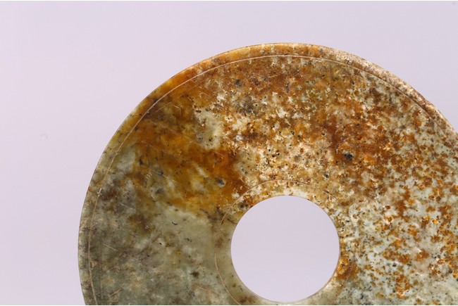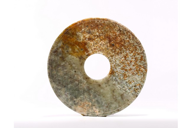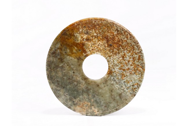 The disc is carved with a hexagonal grid pattern, the celadon stone with concentrated areas of mottled russet and white inclusions. Han Dynasty or later.