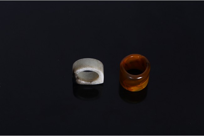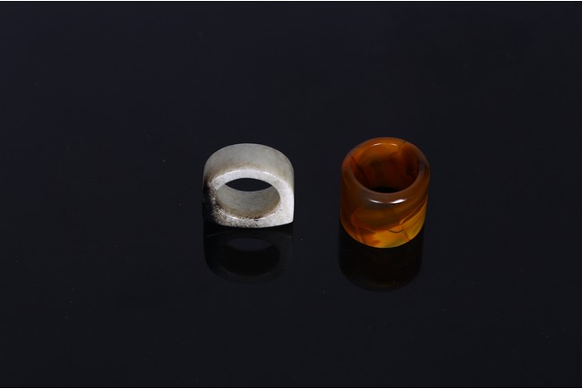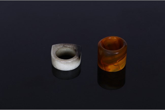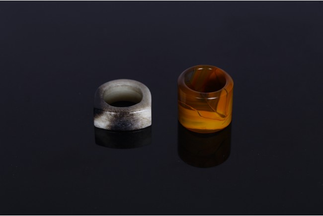 Comprising of a striped pattern agate archer's ring and a mottled white and black jade saddle ring. Qing Dynasty period.
