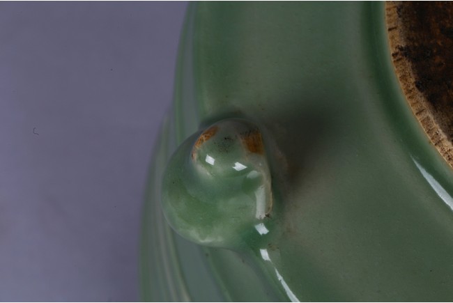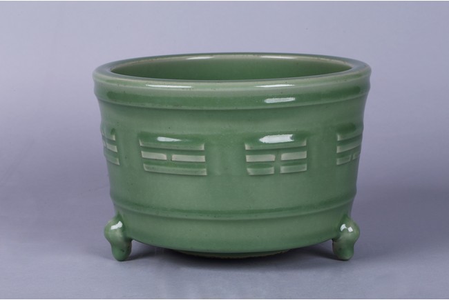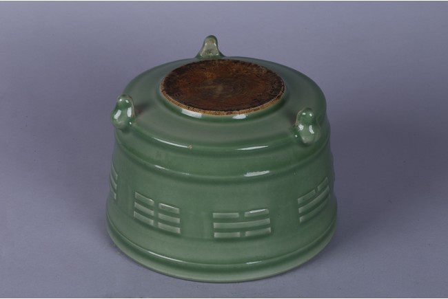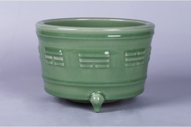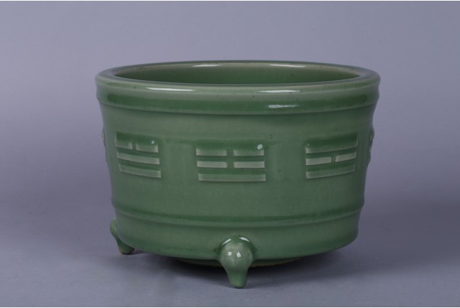 The cylindrical slightly flaring sides carved with the 'Ba Gua' (Eight Trigrams) above short feet, applied overall with a pale green glaze.