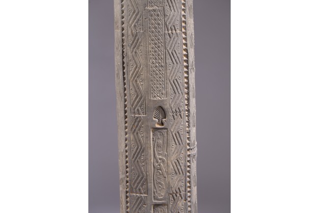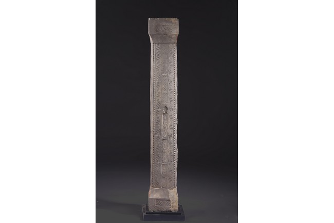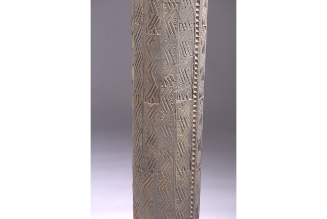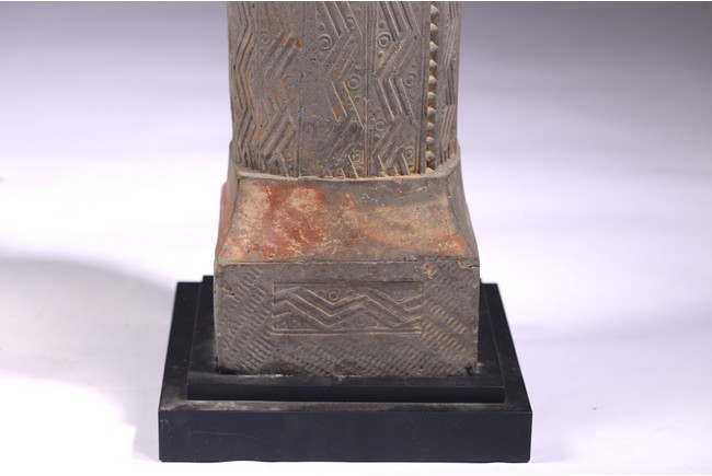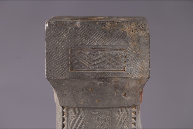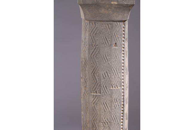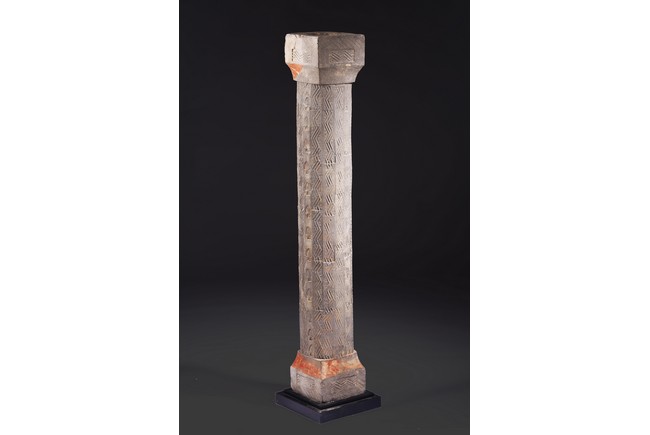 The gray hollowed earthenware pillar impressed and carved with rows of geometric design interrupted by rows of leaf motifs at the four corners. Western Han dynasty (206 B.C.–A.D. 9),1st century B.C.