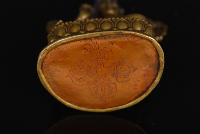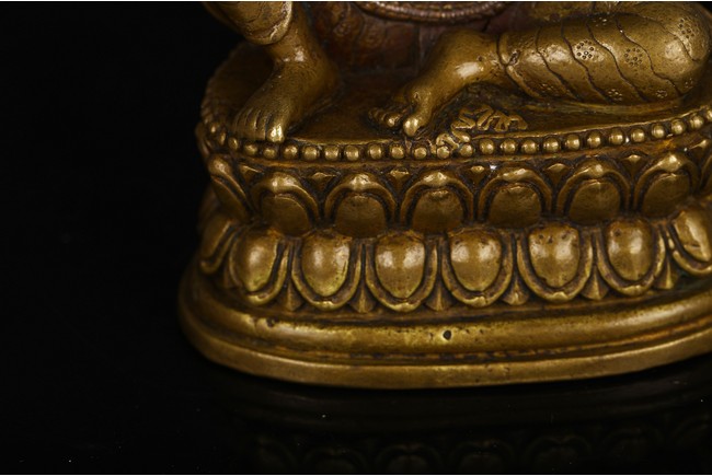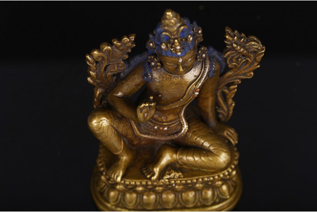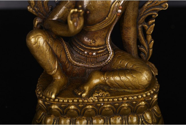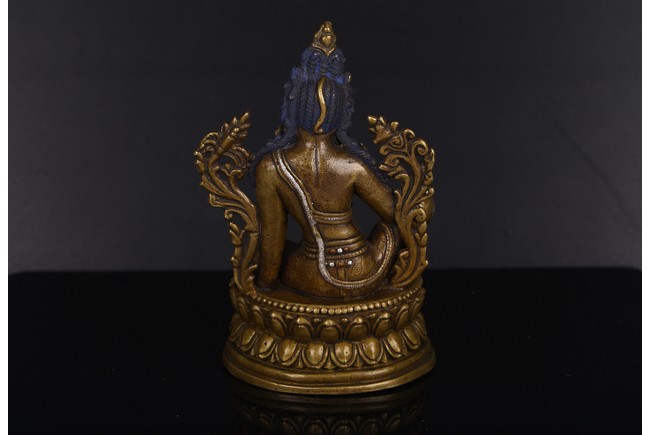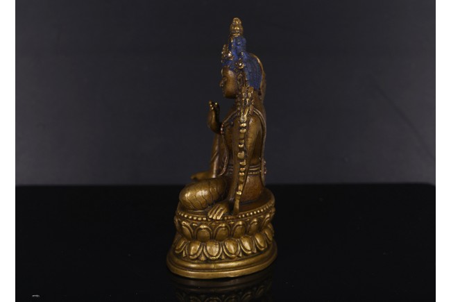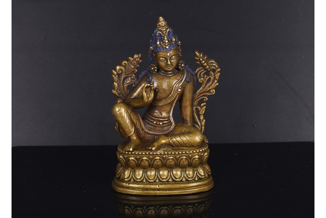 Pala Style.Seated in lalitasana on a double-lotus with right knee raised, her right hand raised, dressed in striated robes falling over one shoulder and adorned with a belt and beaded jewelry, the face with full lips and heavy-lidded eyes, surmounted by a diadem, hair painted in blue pigments. Possibly 13th century.