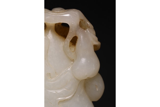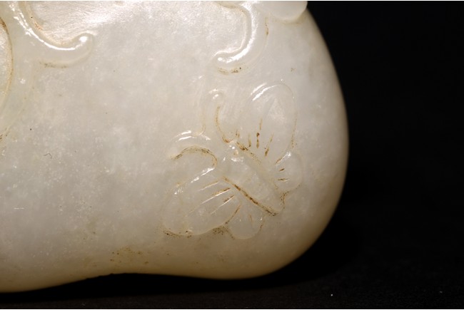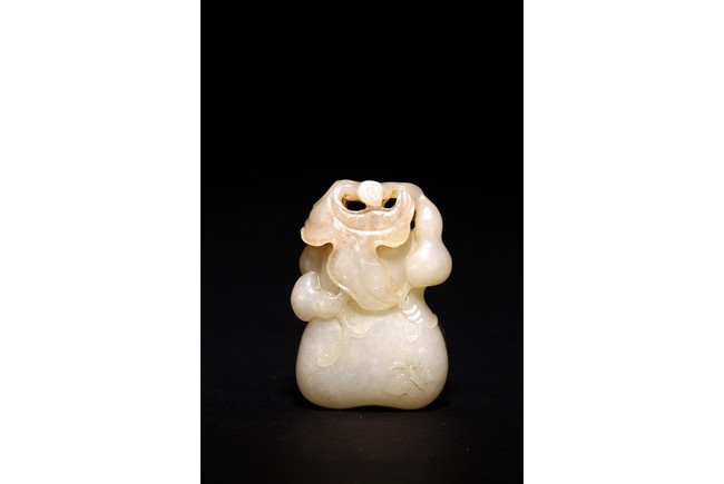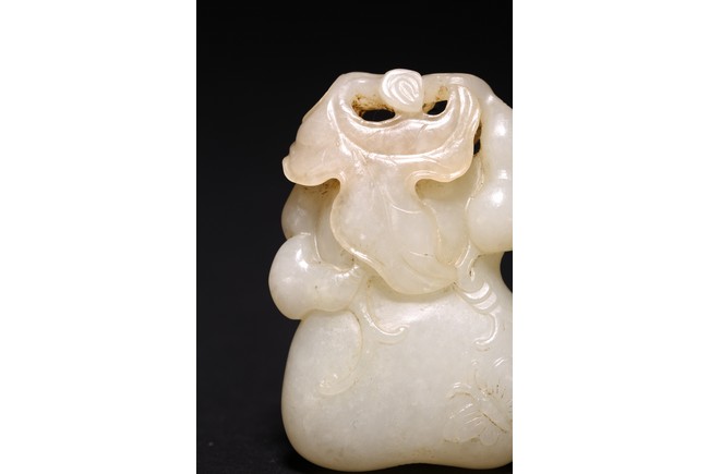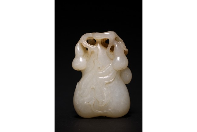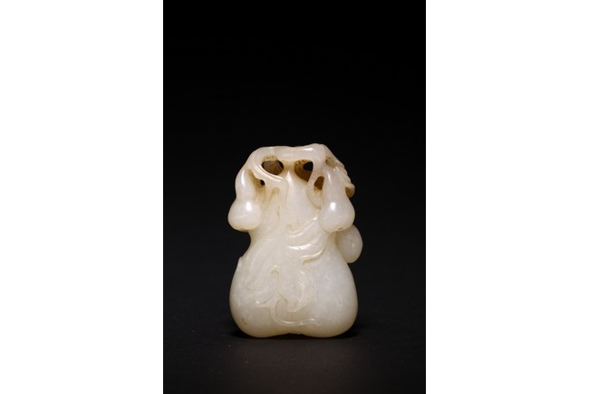 Qing Dynasty period. Carved in the form of a double gourd borne on gnarled leafy vines suspended with smaller double gourds, the stone of an even white tone.