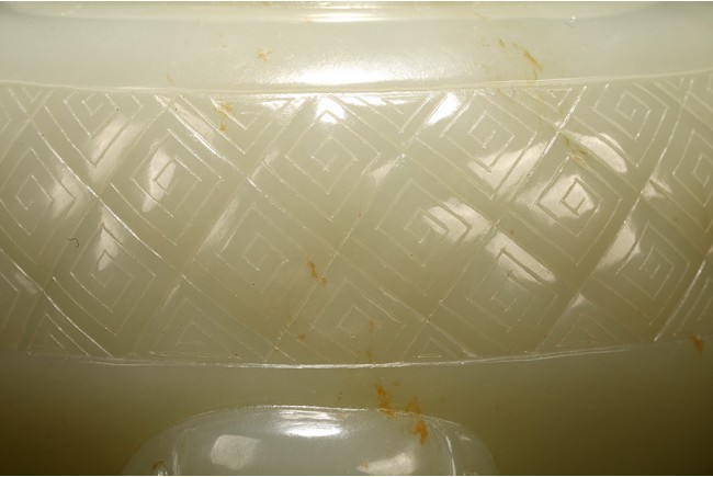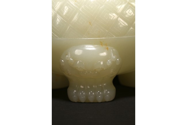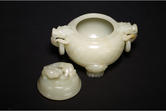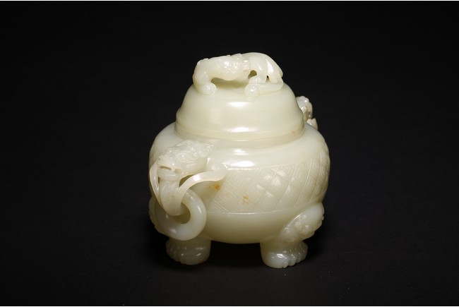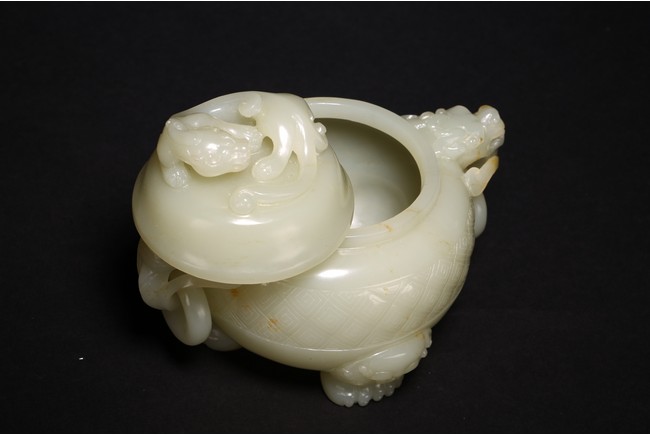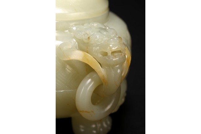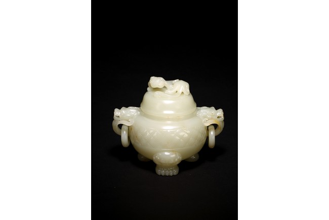 Qing Dynasty period. Of globular form, set with lion-mask ring handles to either side, raised on three short cabriole legs, the cover with a 'chilong' knop, the body carved with a raised band of geometric key-fret pattern, the stone is of well polished white tone.