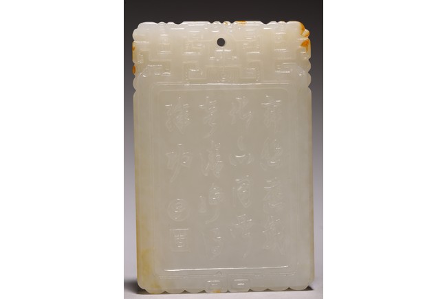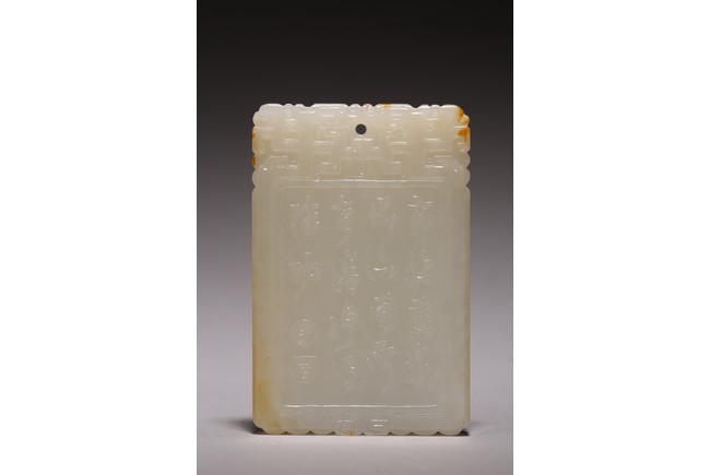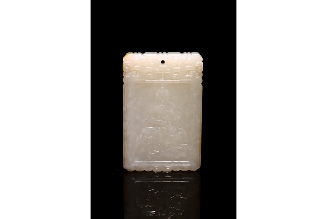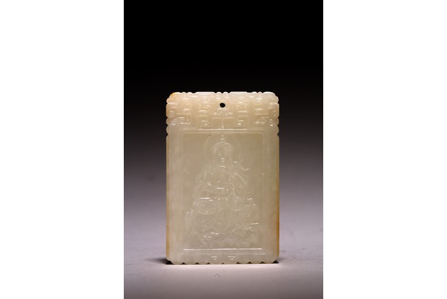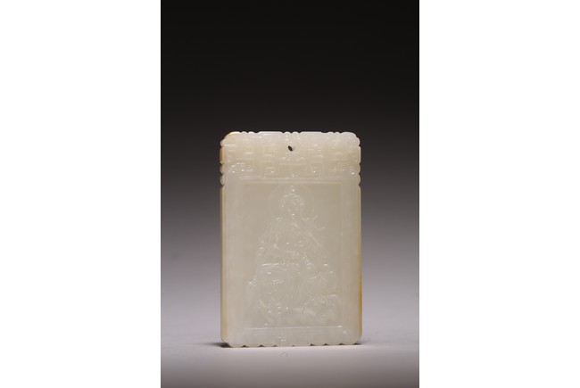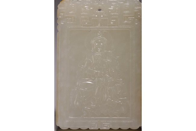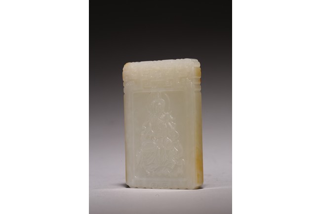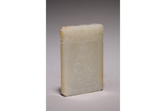 Chinese.The rectangular plaque is finely carved to one side is carved with a seated Guanyin wearing ornate robe and jewelry, head backed by an aureole while the other side is carved with a poem followed by two seal marks. Qing Dynasty period.