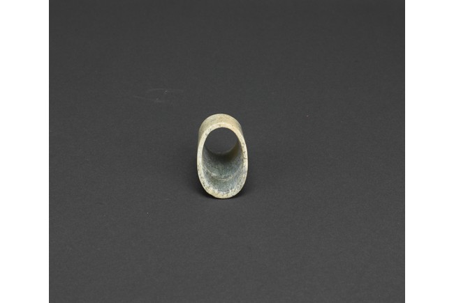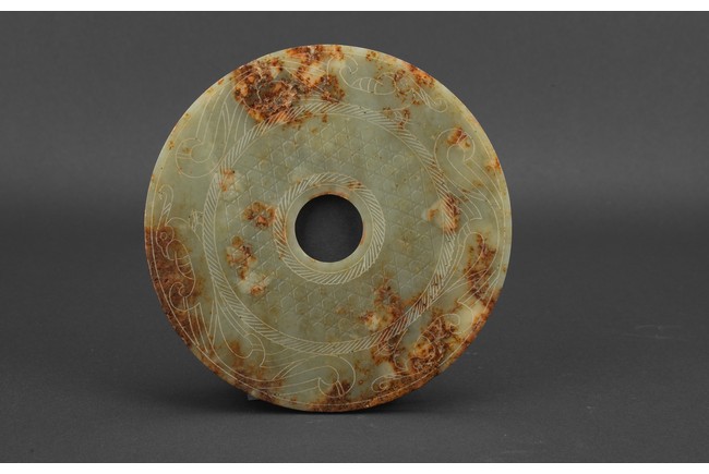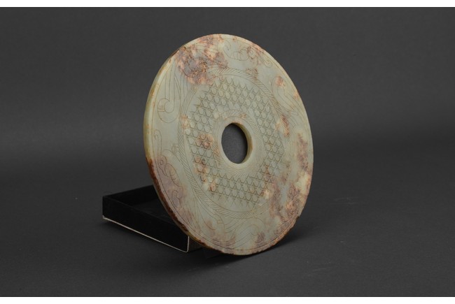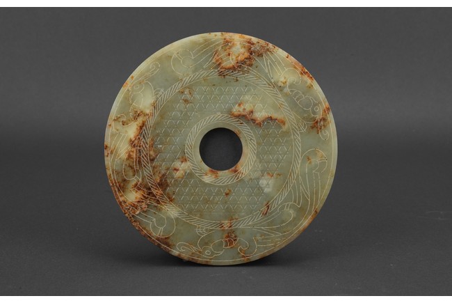 Comprising of a green circular jade disc encircled with incised stylized phoenix and geometric pattern; and a tapered form horse-hoof shaped jade ornament hollowed out in the center. Han Dynasty and Neolithic period.