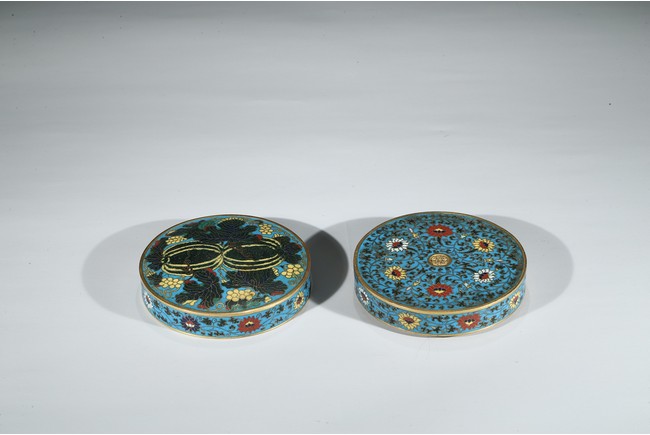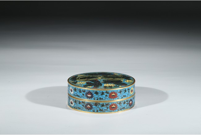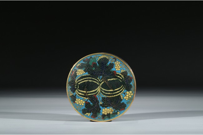 Of circular form, the box enamelled with two large melons and fruits borne on leafy branches, the side decorated with lotus scrolls, the base with four character Qianlong mark, all reserved on turquoise ground. Qing Dynasty period.