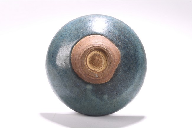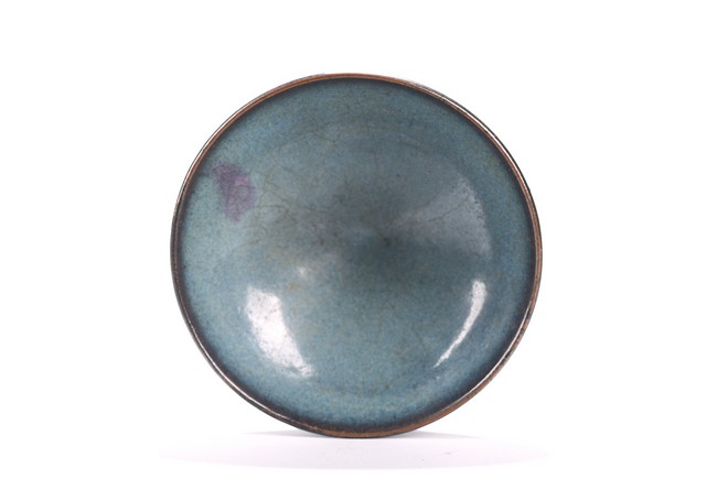 The thickly potted body with rounded sided rising from a short tapering foot, the body covered in a thick lustrous sky-blue glaze thinning to mushroom tones at the mouth rim and irregularly stopping just above the foot, with a purple splash to the interior. Yuan/Ming Dynasty period.
