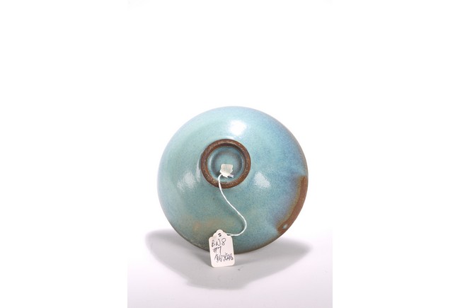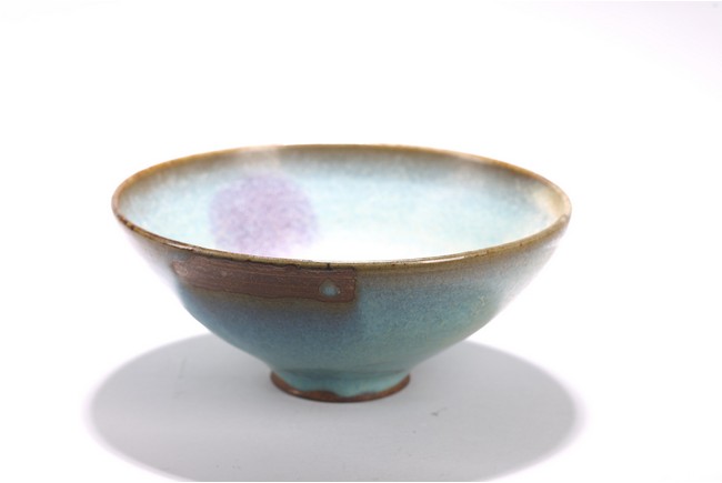 With rounded sides and a short straight foot, covered inside and out with a thick glaze of pale milky blue tone, with an irregularly-shaped splash of purple swirl at the interior. Yuan/Ming Dynasty period.