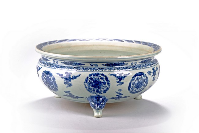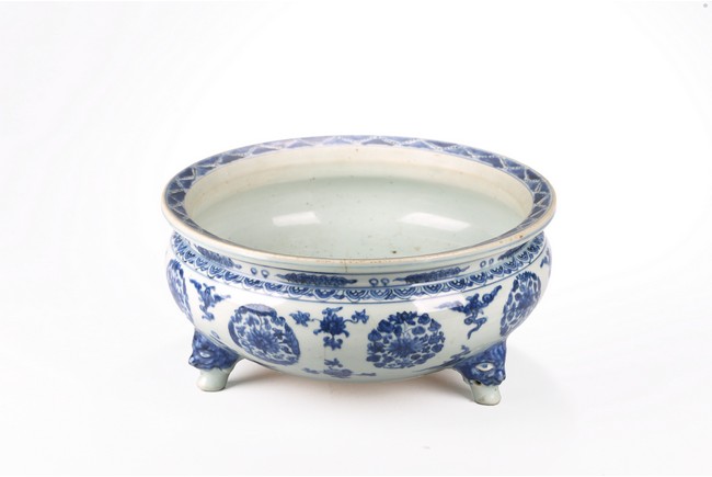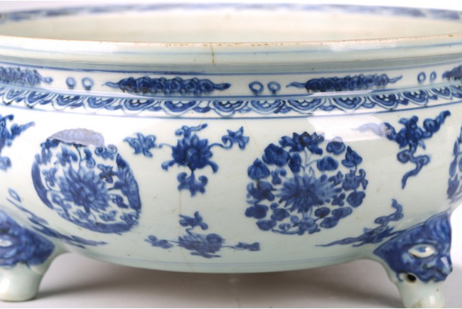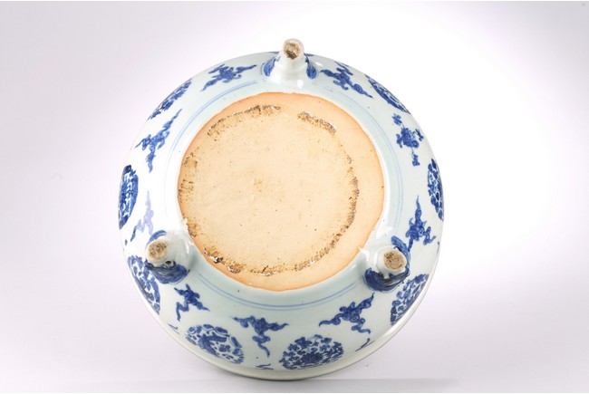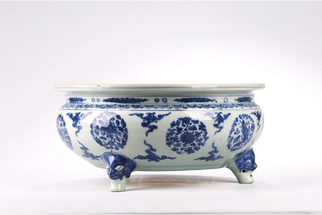 Of compressed globular form and supported on three short mythical beast-mask feet, decorated on the exterior with floral roundels, clouds, and floral sprays, the underside left unglazed. Qing Dynasty period.