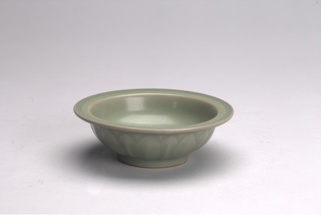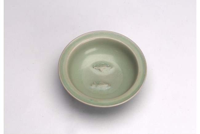 The center of the interior moulded with two fish, the exterior with petal ribs, all under olive green glaze thinning at the rims and stopping neatly around the foot.