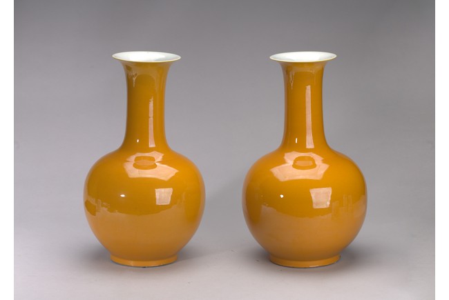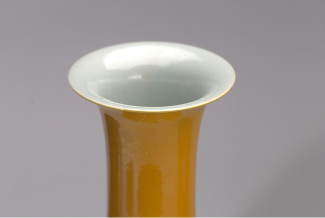 The ovoid body supported on a slightly spreading foot and rising to a slender waisted neck and flared rim, covered overall in a deep yellow glaze, the base glazed in white. Qing Dynasty period.