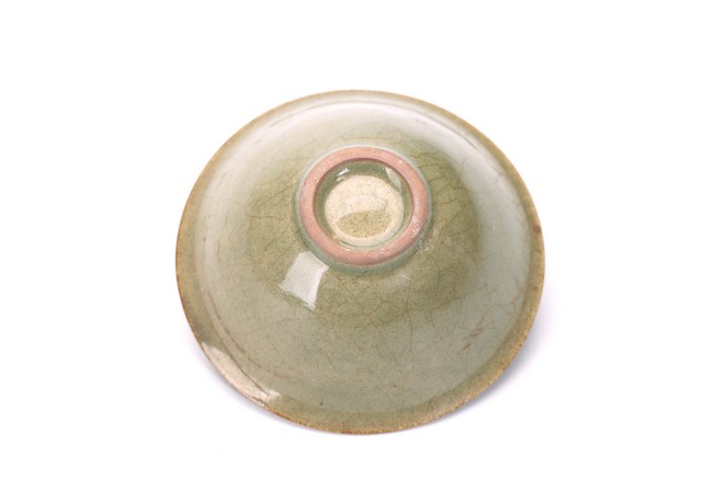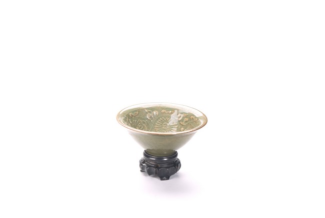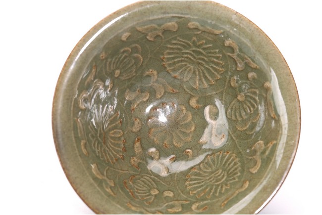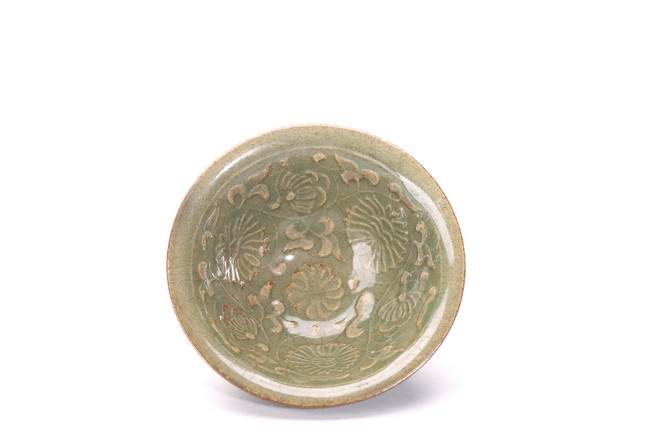 The interior moulded with chrysanthemum scrolls, overall covered with olive green glaze saving the base rim.