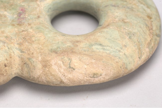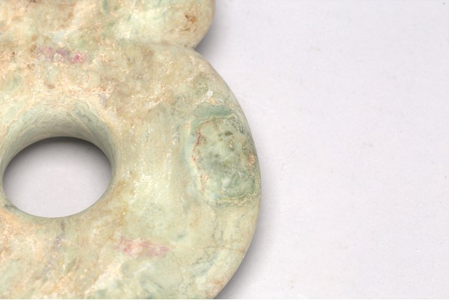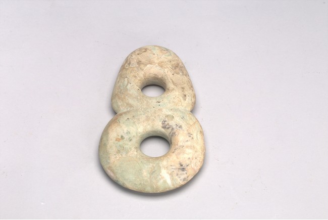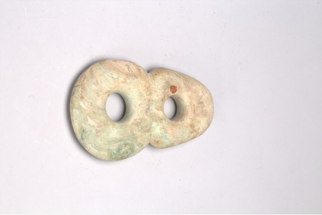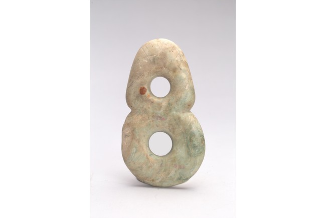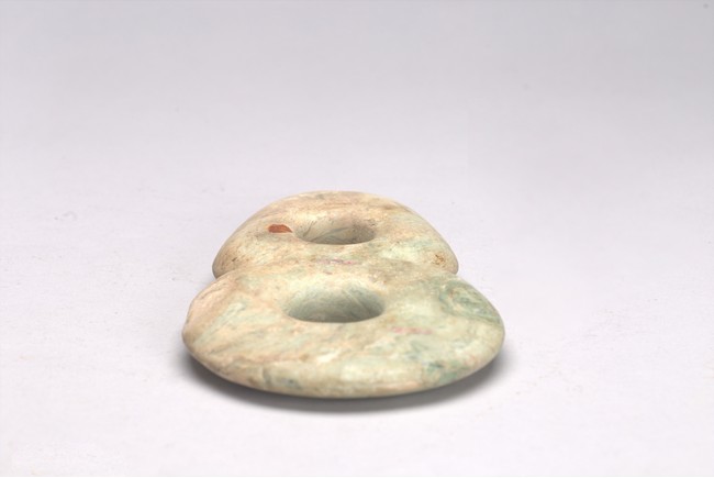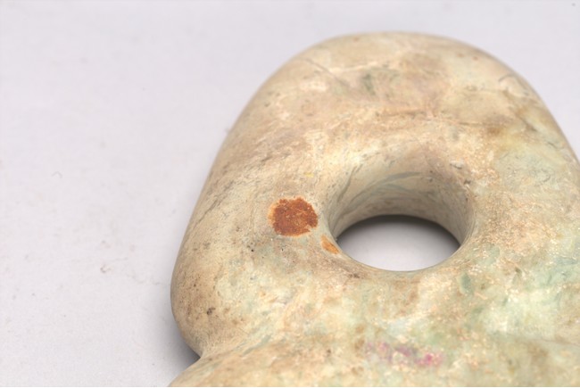 The ornament pierced with two perforations of increasing sizes with the outline corresponding in form,the stone calcified to various degrees.