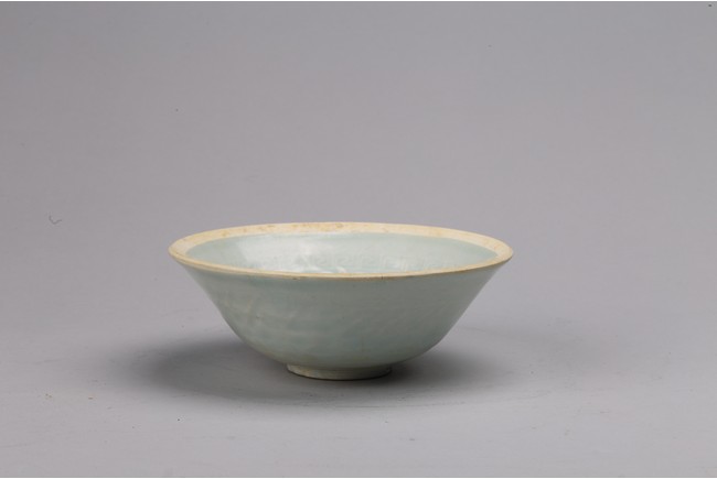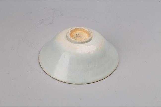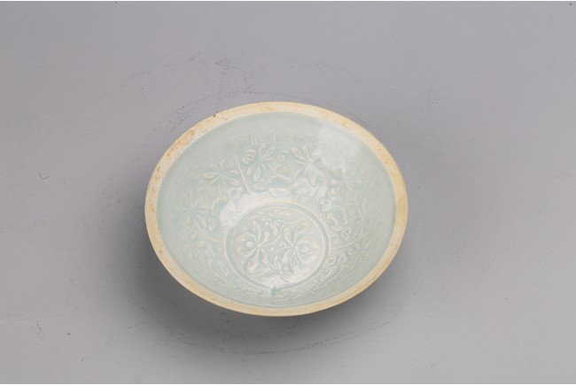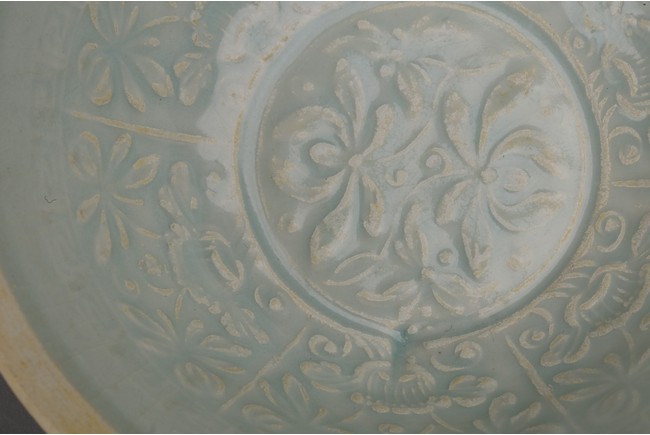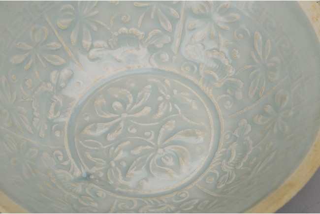 Chinese. Interior carved with pairs of foliage design at the center and around the interior wall in low relief, covered in attractive blue glaze except the base and rim. Song Dynasty period.