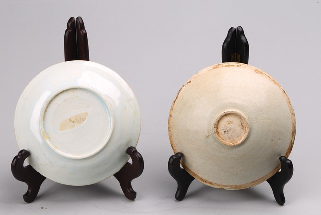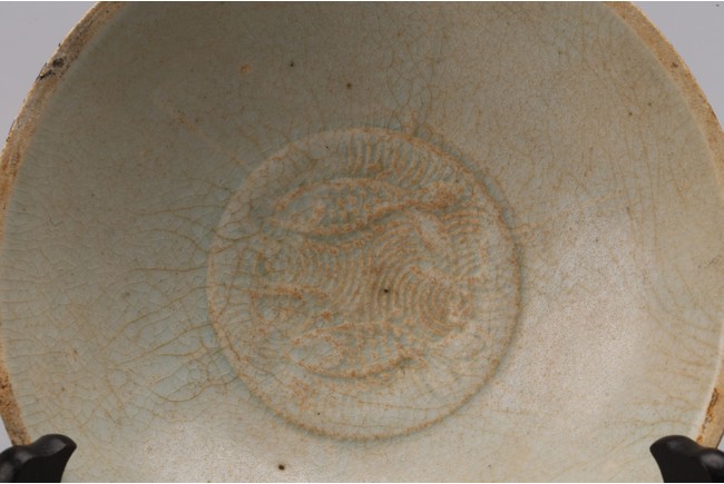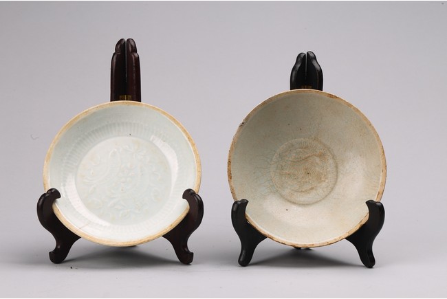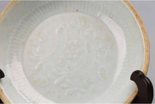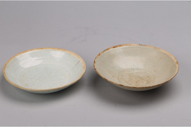 Chinese. Comprising of two carved Yingqing dishes, with double fish and foliage designs. Song Dynasty period.
