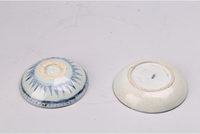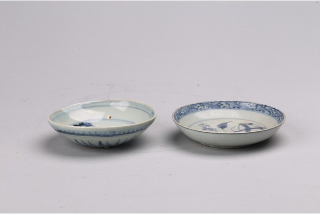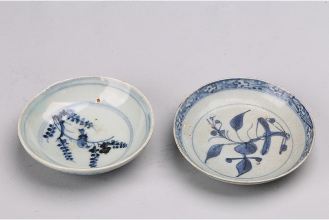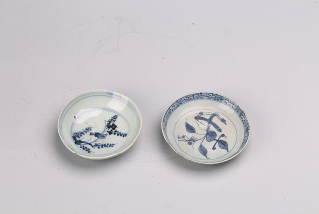 Chinese. Comprising of two blue and white dishes, with leaves and branch designs. Qing Dynasty period.