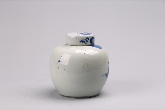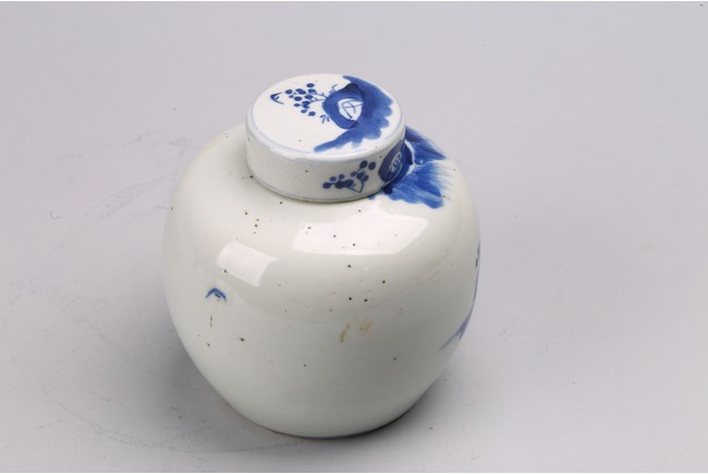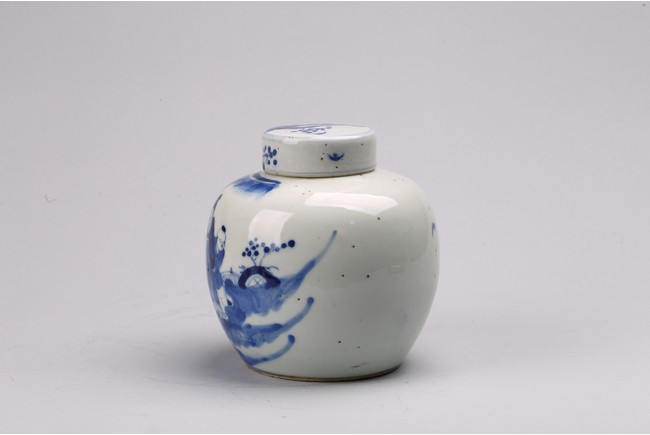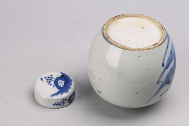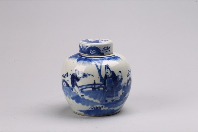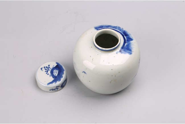 Chinese. Comprising of a blue and white 'figures' jar, and a blue and white 'landscape' paste ink box. Qing Dynasty period.
