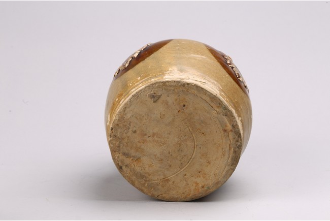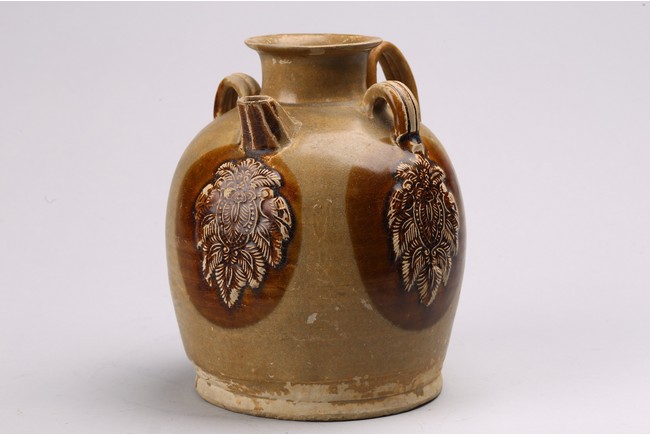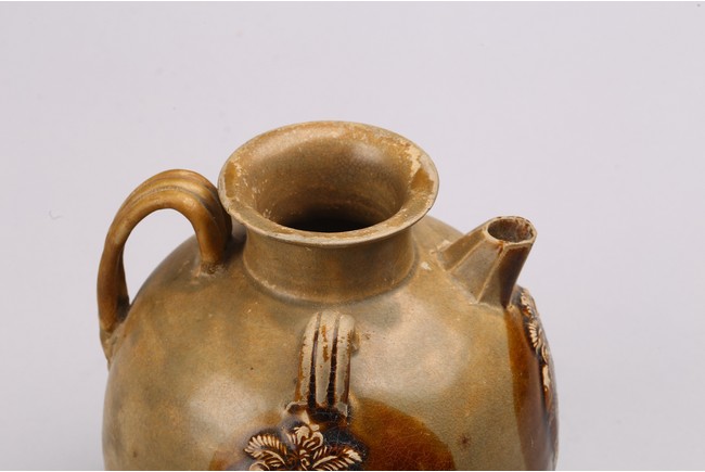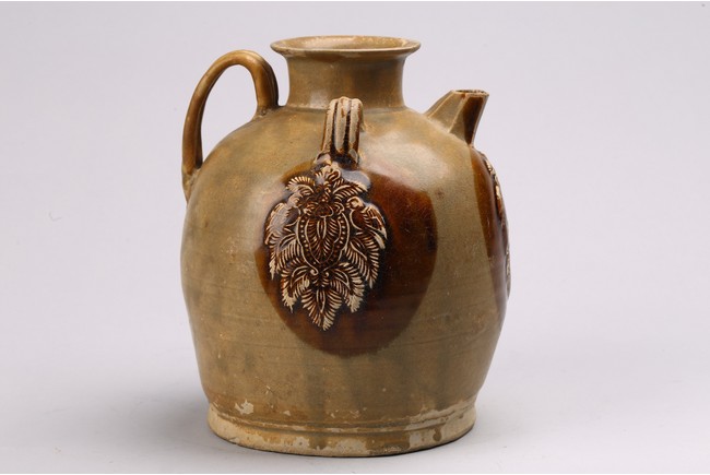 Chinese. Body decorated with raised leaf motifs, short spout, covered with brown glaze. Tang dynasty period.