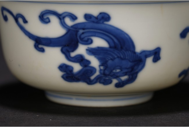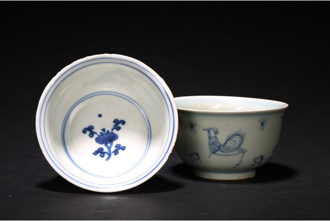 Chinese. Comprising of two blue and white bowls, one decorated in cobalt blue with chilong, the other with chicken and insects. Ming and Qing Dynasty period.