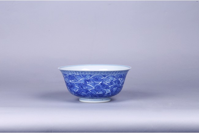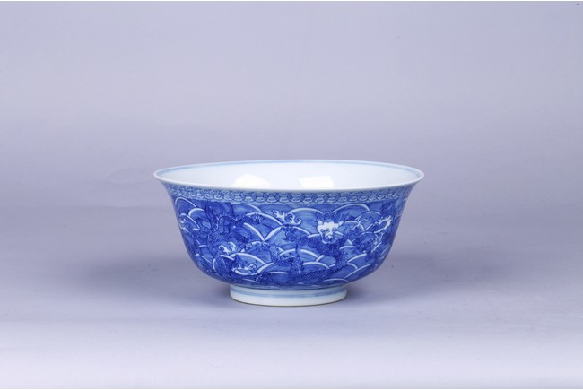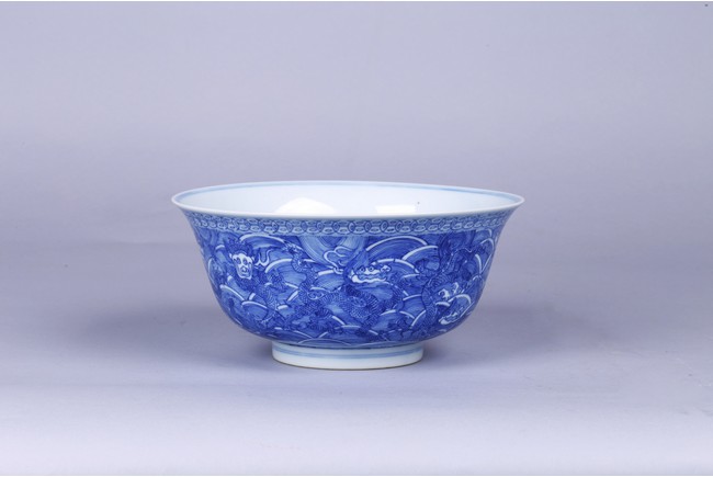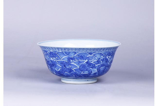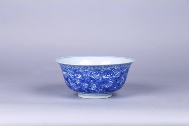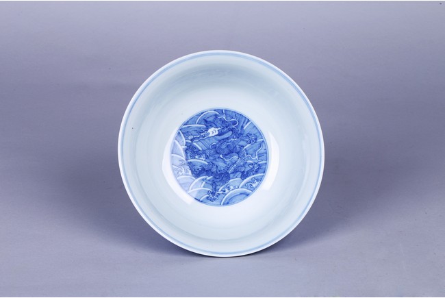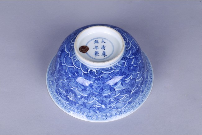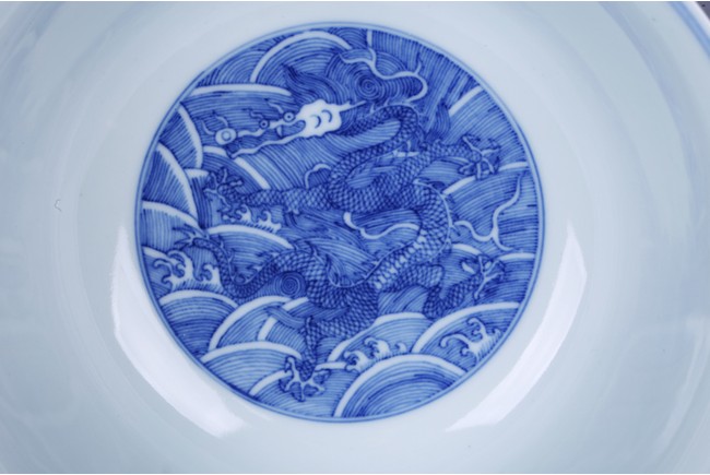 Painted to the exterior depicting crashing waves with sinuous dragons, the interior with a central medallion enclosing a single writhing dragon, the base inscribed with Kangxi mark. Qing Dynasty period.