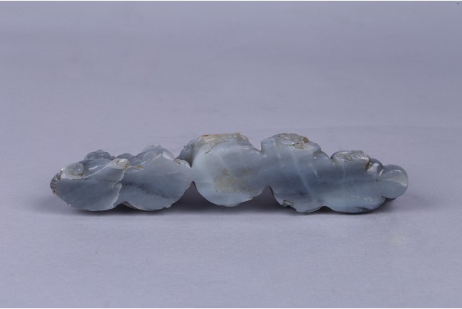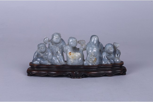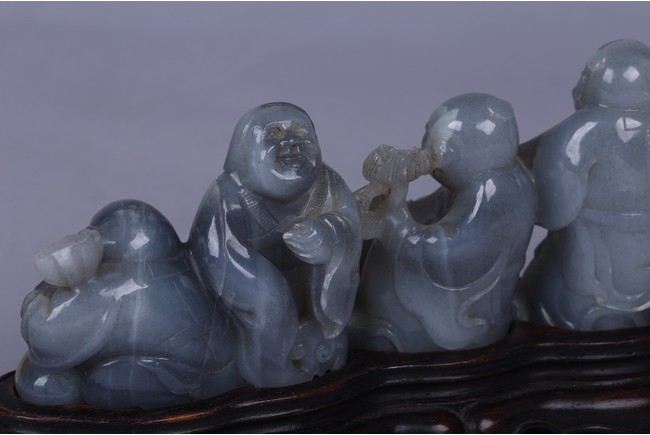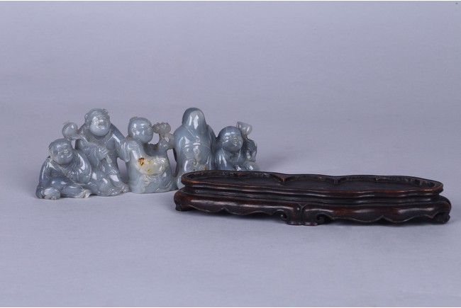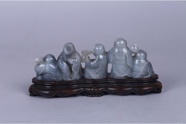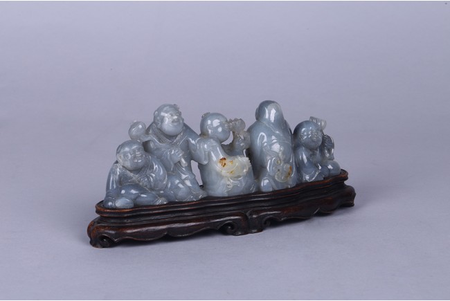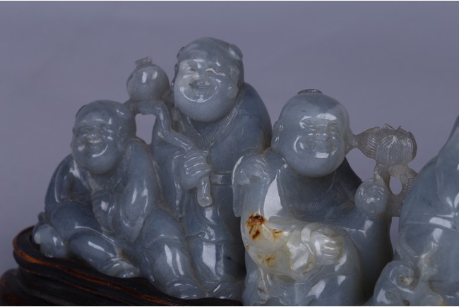 Carved horizontally with five boys figures, each depicted with joyful expression, the stone is of mottled white and gray tone. Qing Dynasty period.