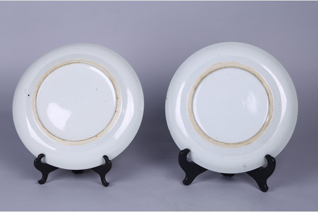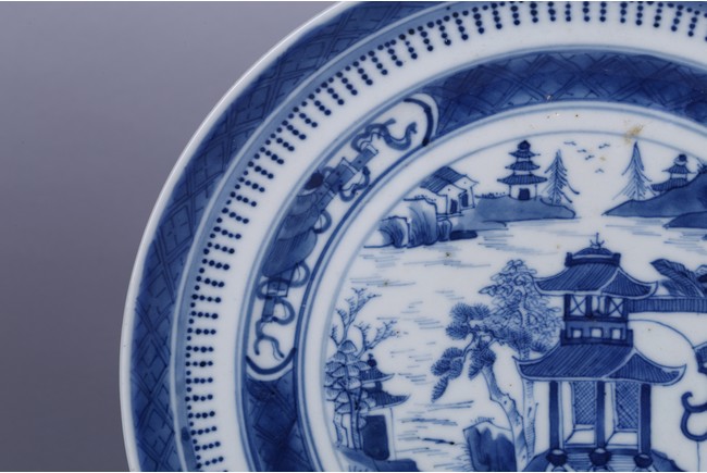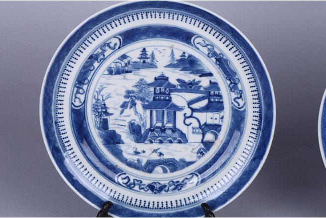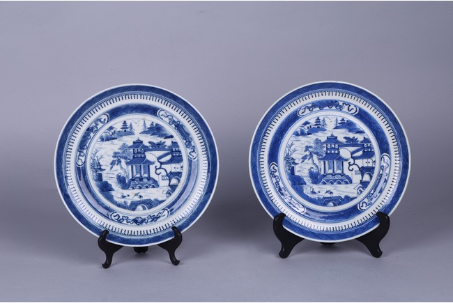Each dish decorated with lakeside scenes including pavilions, palaces, and gardens. Qing Dynasty period.