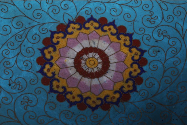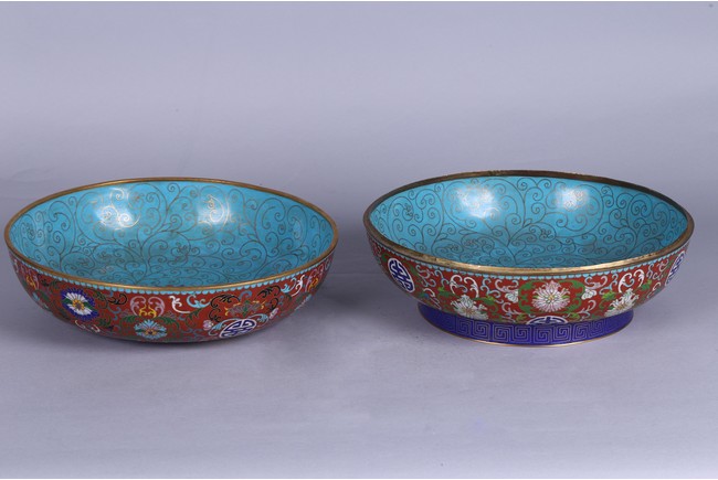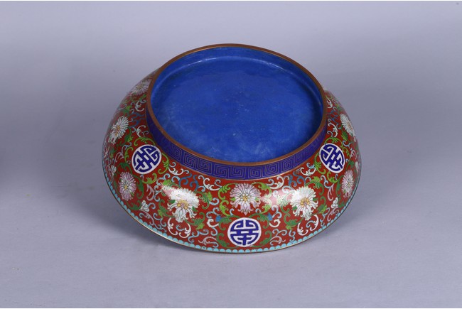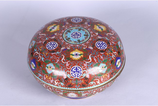 Of circular form, decorated with lotus scrolls and auspicious motifs reserved on red enamel ground. Republic period.