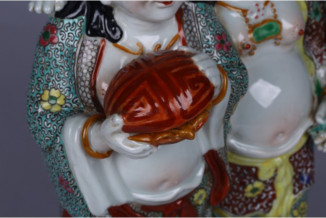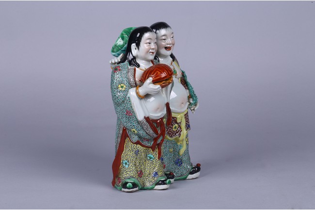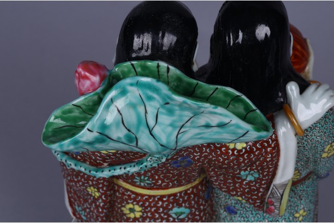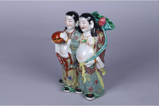 Modelled in the form of hehe erxian, one holding a box and the other holding a lotus branch, the base impressed with mark. Republic period.