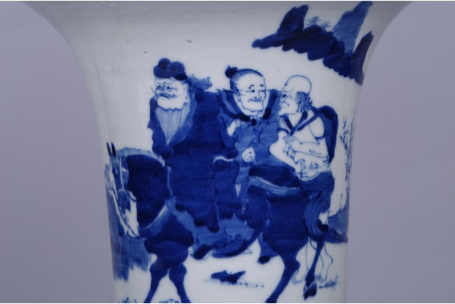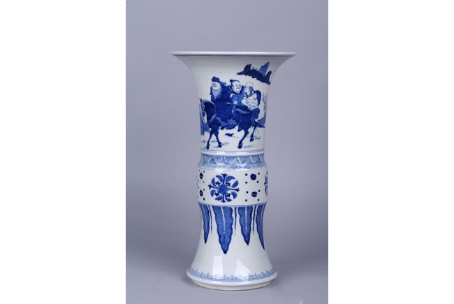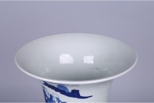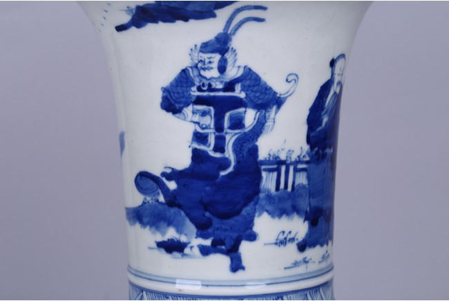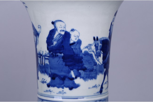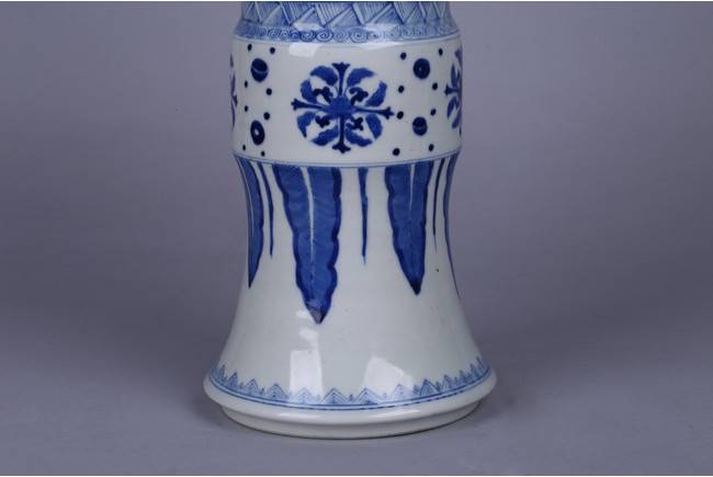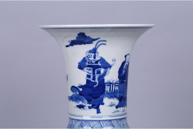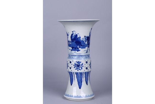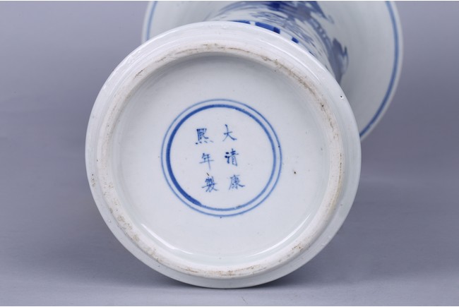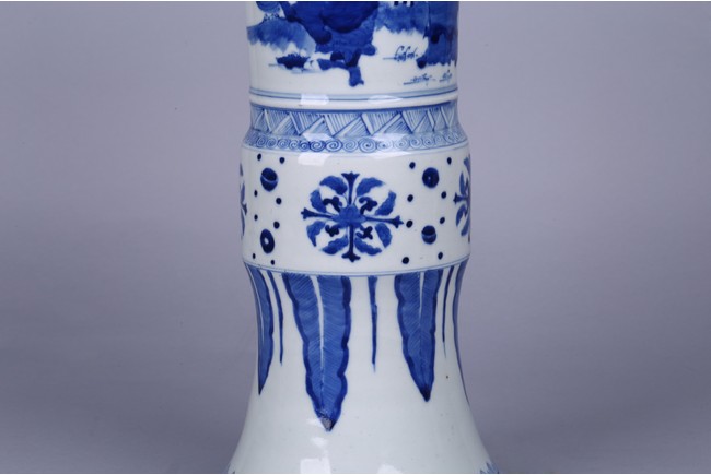 Painted with various figures to the upper section, lower section with band of pendent plantain leaves, the base with apocryphal reign mark. Qing Dynasty period.