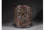 A CHINESE AGARWOOD CARVED 'LANDSCAPE' BRUSHPOT