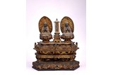 A GILT LACQUER INSCRIBED WOODEN BUDDHA GROUP