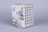 晚清 民國 蔣玉卿 淺绛彩人物詩文筆筒