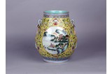 二十世紀 粉彩黃地開光山水尊