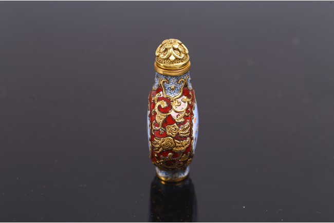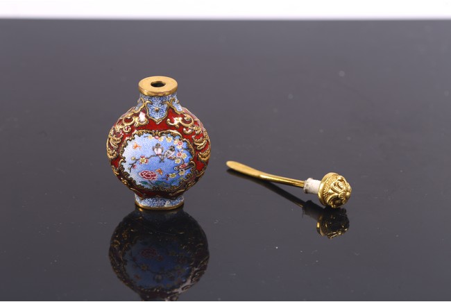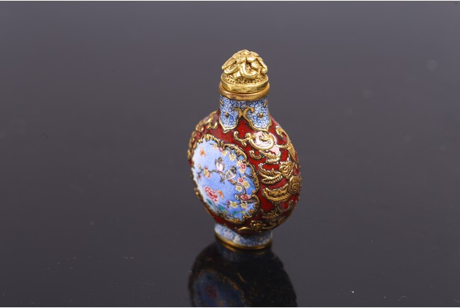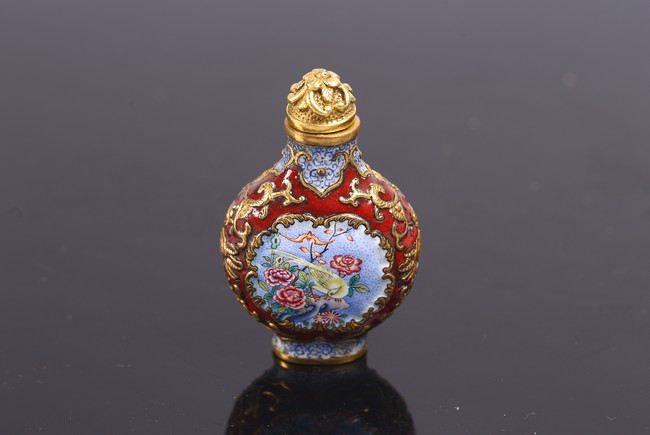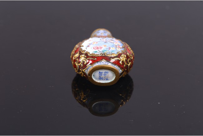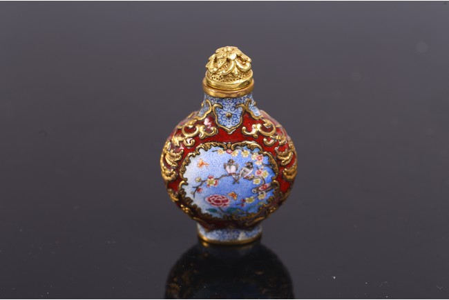 The body is delicately enamelled on either side with panels enclosing bird and flowers on one side and flowers perching on branch on reverse, all reserved on gilt copper ground mount finely worked as floral scrolls reserved on red enamel ground, the base inscribed with reign mark.