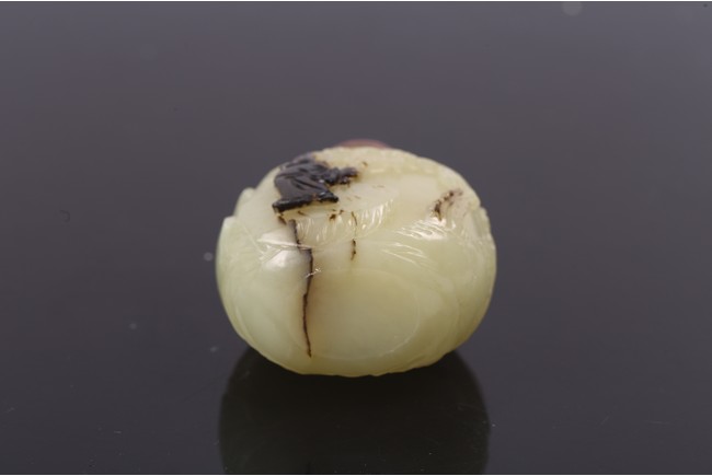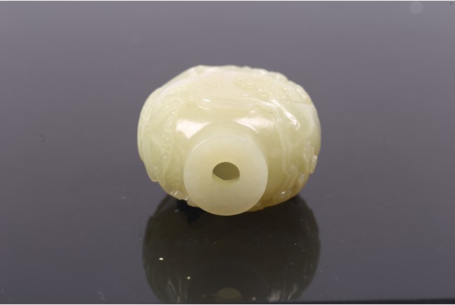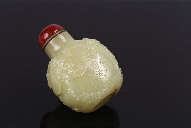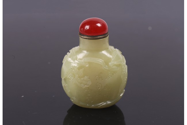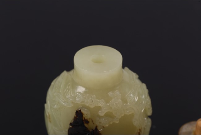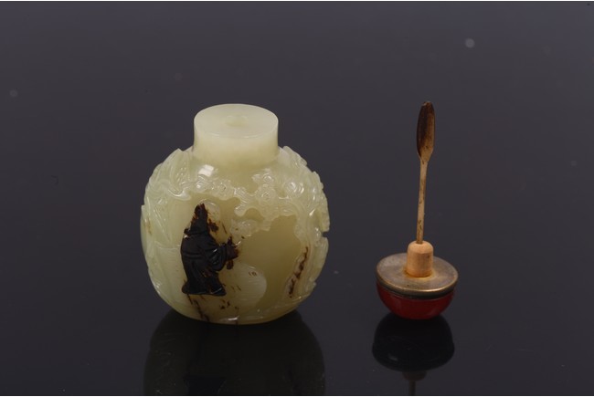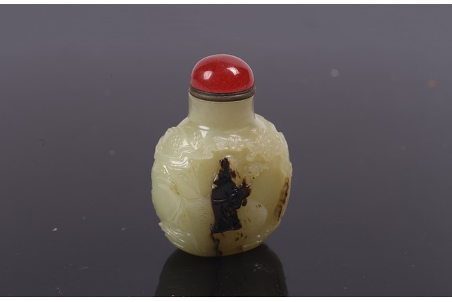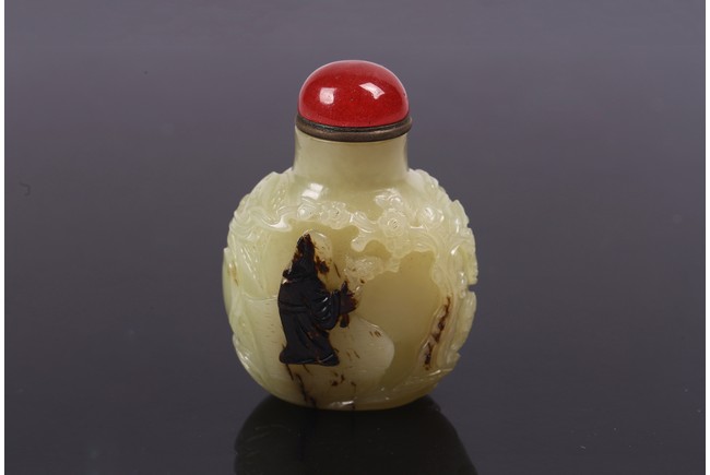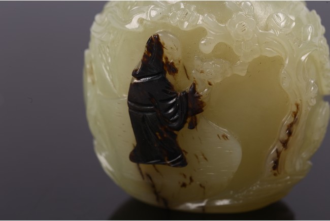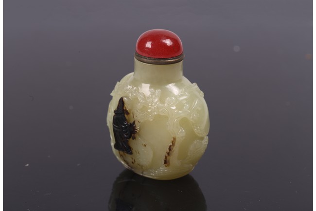 this ovoid bottle is meticulously carved from white jade stone, featuring dark brown markings cleverly incorporated to depict an elderly figure picking a prunus blossom beneath a prunus blossom tree on one side. The reverse side showcases pine trees growing from the overhanging cliffs, complemented by cursive script calligraphy. Qing Dynasty period, 18th or 19th century.