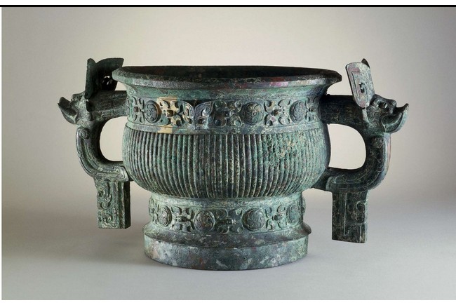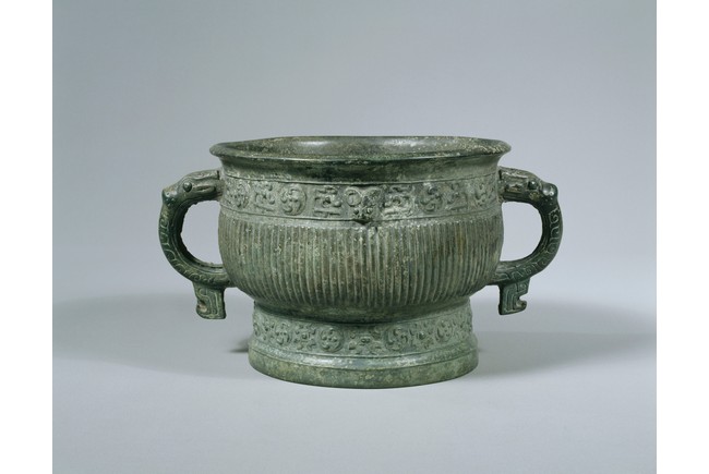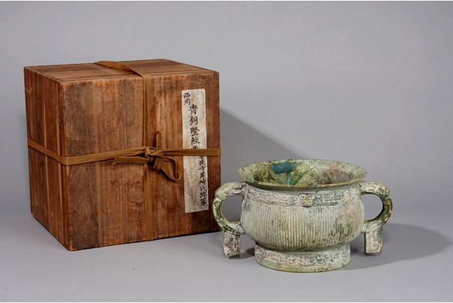 The sides of the vessel are cast with vertical ribbing, featuring an upper band adorned with dragon pairs at the center of each side interrupted by high-relief animal masks. The splayed foot is decorated with a band of kui dragons. The loop handles are adorned with horned feline masks and end in a vertical tab cast with stylized dragons. West Zhou Dynasty period. Accompanied by a Japanese wooden box with a written label.