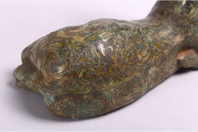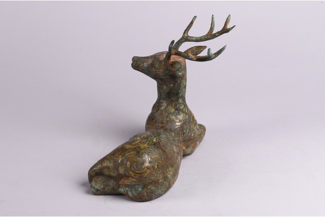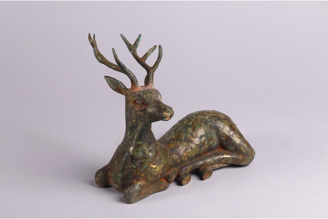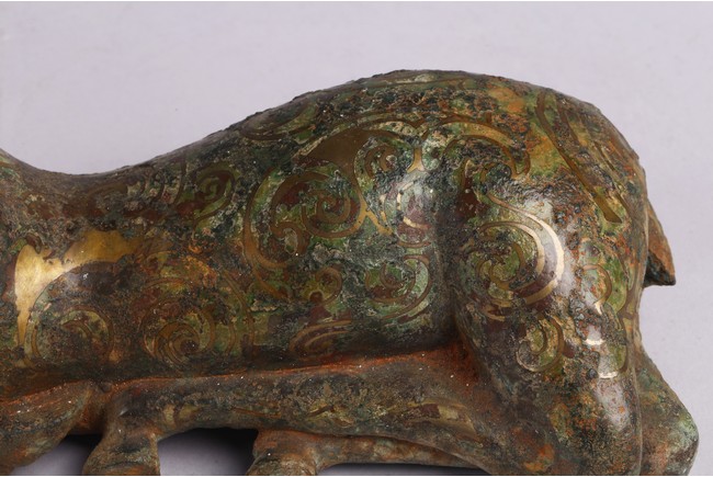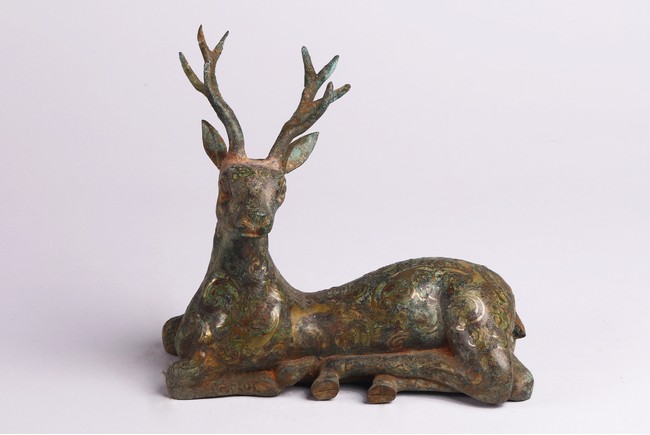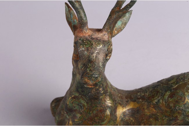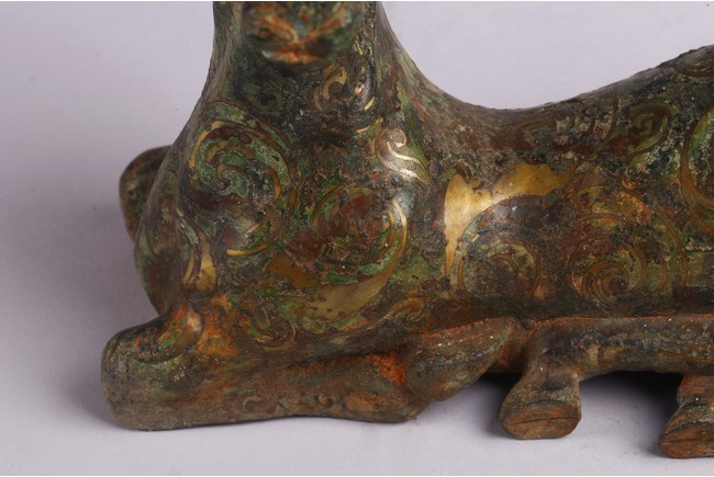 Finely modeled with the legs tucked under the body, the head turned, with large eyes and impressive antlers, the body and head are inlaid in gold with geometric scrolls. Possibly Warring State period.