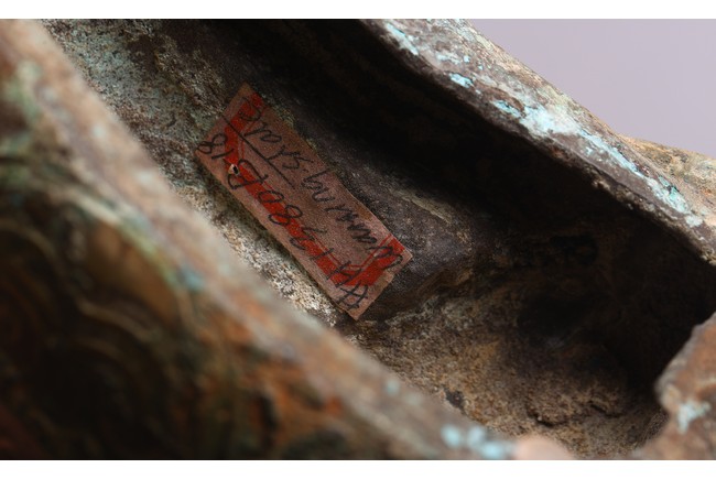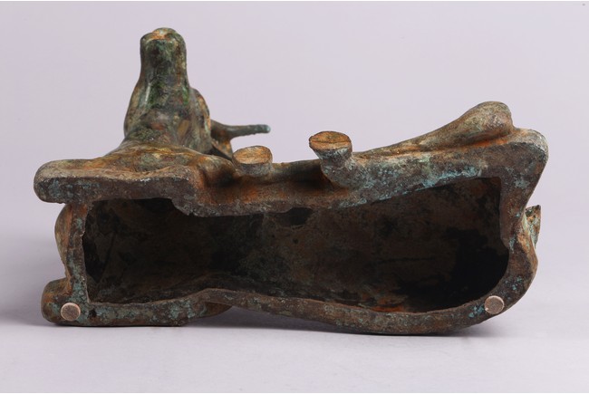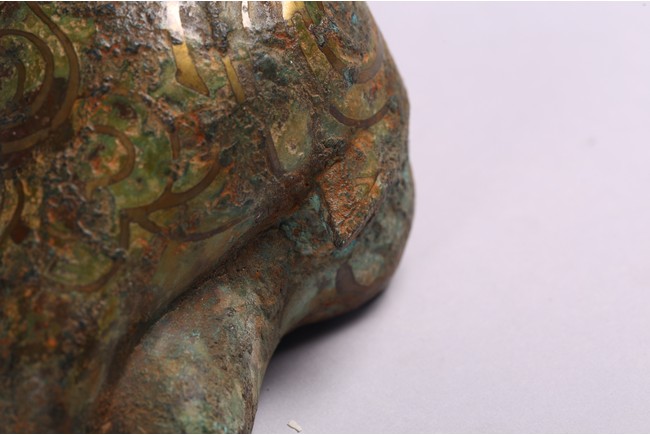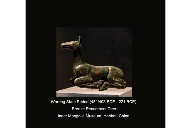Provenance: From the private collection of Little Meditation Retreat, New York 來源:紐約「小眠齋」私人收藏 金銀錯技法起源於春秋戰國之際,盛行在戰國中晚期和西漢。戰國時期宴飲是國與國間外交活動中非常重要的儀式,宴會中陳設新奇器物,可創造話題性並促進交流。此時期青銅工藝中,鑲嵌、金銀錯、包金、鏤刻等金屬細工技術發展達到高度水平。銅錯金銀臥鹿十分少見,可參考同時期戰國青銅臥鹿,藏於內蒙古博物院。 The origin of the gold and silver inlay technique can be traced back to the Spring and Autumn period, flourishing during the late Warring States period and Western Han dynasty. Banquets held during the Warring States period were crucial diplomatic events between states, and the display of novel artifacts during these feasts served to spark conversation and facilitate exchanges. During this era, advancements in bronze craftsmanship, including techniques such as inlaying, gold-silver juxtaposition, gilding, and engraving, reached a high level of sophistication. Gold and Silver inlaid bronze animal models depicting deer are particularly rare. Refer to a Warring States period bronze deer in the collection of Inner Mongolia Museum.