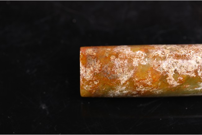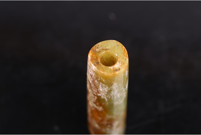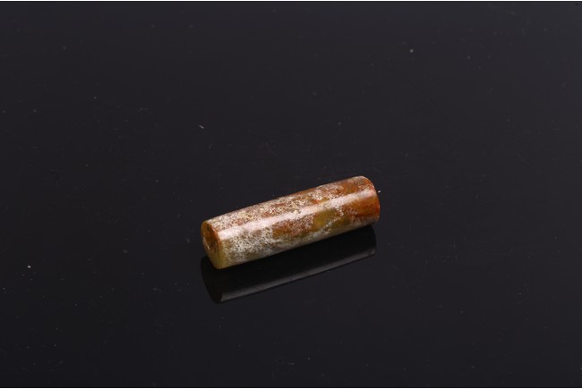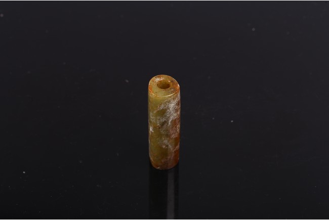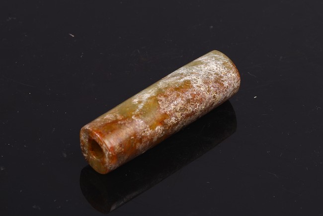 The cylinder with a central channel drilled from both ends, the stone of mottled white, reddish brown, and celadon tone. Shang Dynasty period or later.