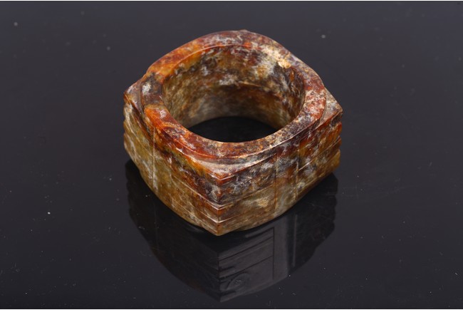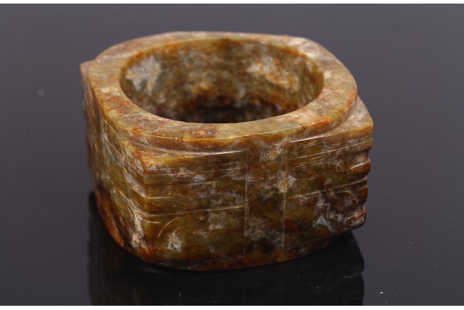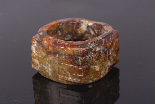 Of short cylindrical square section, each corner carved with a stylised animal mask design, the faces divided with vertical band in the center of each side, the opaque stone of chalky-white tone suffused with russet inclusions, the stone of a yellowish-celadon color mottled with russet and dark brown inclusions. Shang Dynasty period or later.