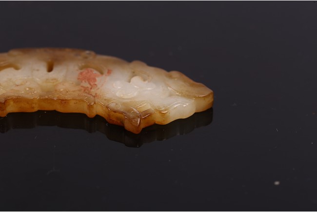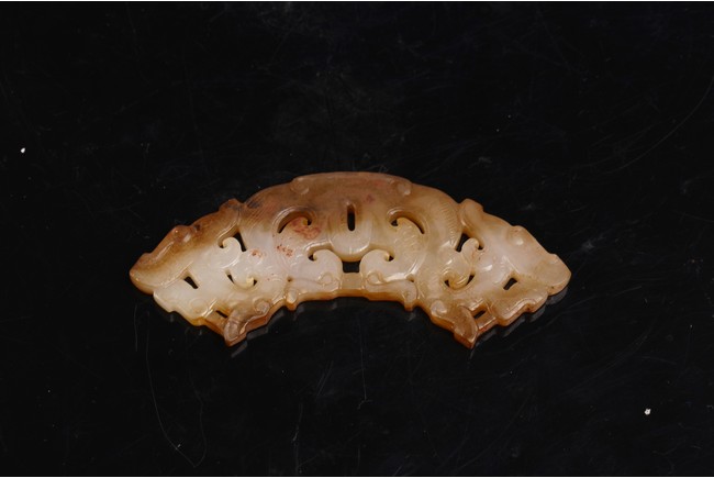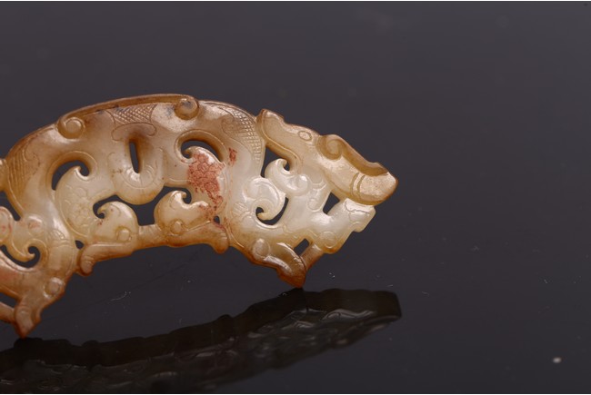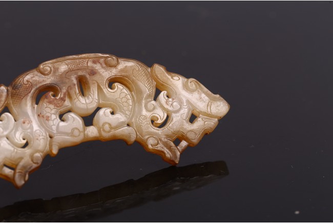 Carved in the form of a joined stylized double dragons with head turned backwards, incised with cross-hatched and scrolling designs, the stone is of polished russet and white tone. Eastern Zhou Dynasty or later.