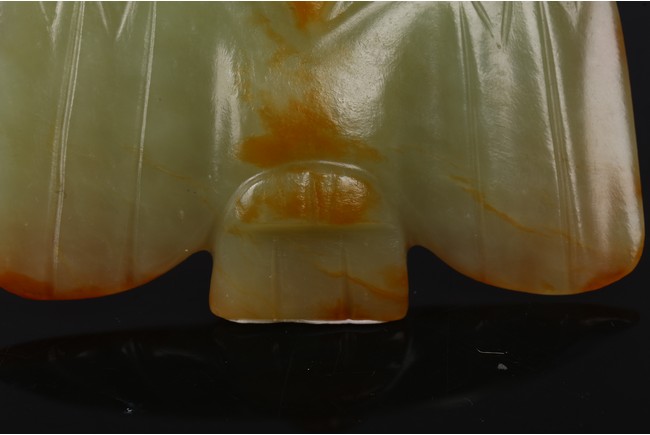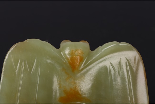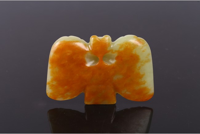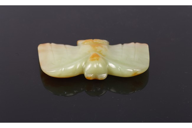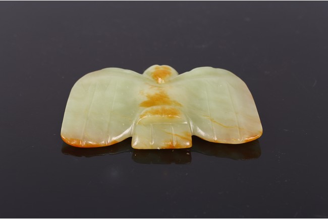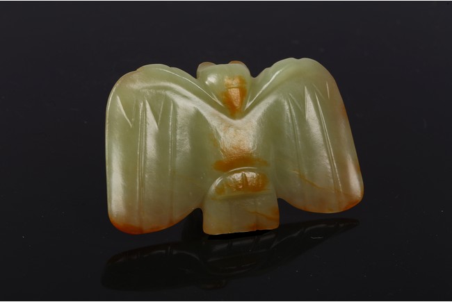 The flattened pendant is carved in the form of a bird with a small head with two protruding eyes and outspread wings incised with vertical lines. The reverse is pierced with two small circular apertures. Neolithic Period, Hongshan Culture or later.