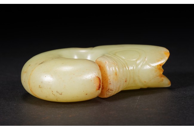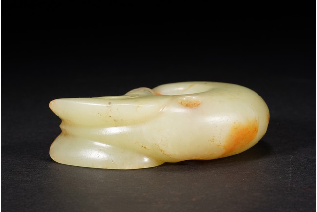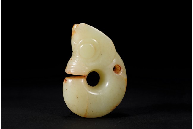 The stone is carved as a coiled stylised mythical animal with two pricked ears above incised features including eyes and nose. It is pierced with a circular aperture to the center opening to a slit on on side with a smaller aperture on the other. Neolithic period or later.